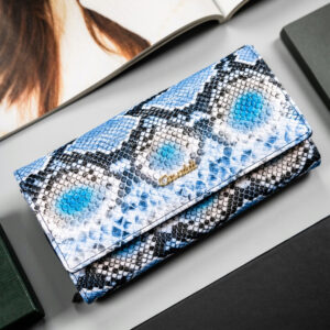 Poziomy portfel damski wykonany ze skóry naturalnej i ekologicznej ze zdobieniem na wzór skóry węża – 4U Cavaldi Portfel jest odszyty z najwyższej jakości skóry naturalnej i ekologicznej. Środek portfela jest wykończony skórą naturalną o gładkiej fakturze, zaś strona zewnętrzna to błyszcząca skóra eko z motywem skóry węża. Praktyczny i bardzo pojemny – wnętrze portfela zostało wykorzystane…