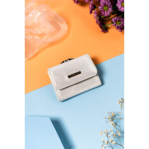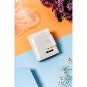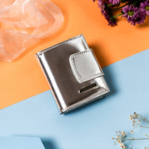 Portfel damski na zatrzask i bigiel z błyszczącej skóry naturalnej – Lorenti Praktyczny i funkcjonalny | Ten model zaprojektowano niezwykle intuicyjnie i funkcjonalnie. Pomimo niewielkich rozmiarów zmieścisz w nim wystarczające ilości dokumentów oraz gotówki; Materiał | Wykonany z naturalnej skóry, w błyszczącym srebrnym kolorze; Zapięcie na zatrzask oraz bigiel | Zapewnia bezpieczeństwo i łatwość użytkowania; Zabezpieczenie kart…