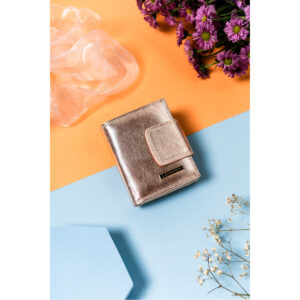Mały portfel damski na zatrzask i bigiel z błyszczącej skóry naturalnej – Lorenti Praktyczny i funkcjonalny | Ten model zaprojektowano niezwykle intuicyjnie i funkcjonalnie. Pomimo niewielkich rozmiarów zmieścisz w nim wystarczające ilości dokumentów oraz gotówki; Materiał | Wykonany z naturalnej skóry, w błyszczącym kolorze różowego złota; Zapięcie na zatrzask oraz bigiel | Zapewnia bezpieczeństwo i łatwość użytkowania;…