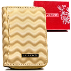 Mały, skórzany portfel damski z systemem RFID — Lorenti Materiał i wykonanie | Wykonany z wysokogatunkowej skóry naturalnej o błyszczącej fakturze w złotym kolorze; Kompaktowe wymiary | Model idealny do wszystkich małych torebek; Funkcjonalność | Pomimo niewielkich rozmiarów pomieści wszystko, co najpotrzebniejsze, czyli kartę/dokument oraz gotówkę; Bezpieczeństwo | Portfel wyposażony w system STOP RFID, który zabezpiecza kartę w portfelu przed…