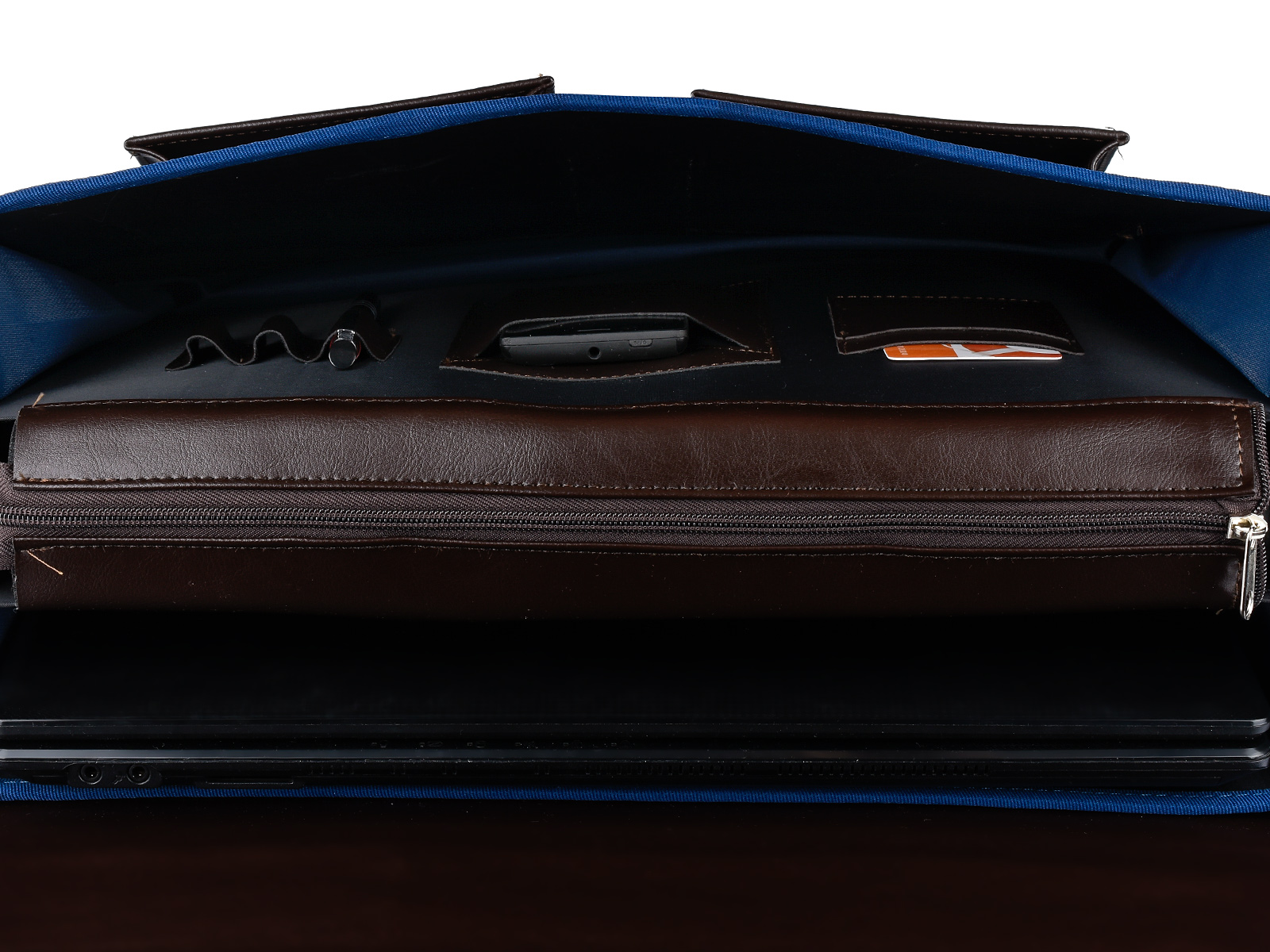 - 1 duża zasuwana komora, będąca jednocześnie przegrodą dzielącą dwie główne komory; 3 schowki na długopisy, 2 schowki na wizytówki, 1 kieszeń na telefon