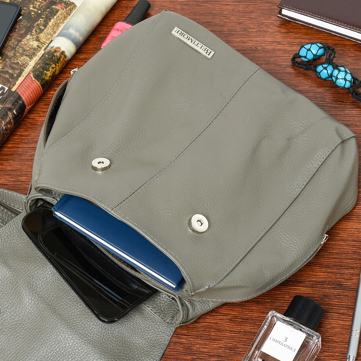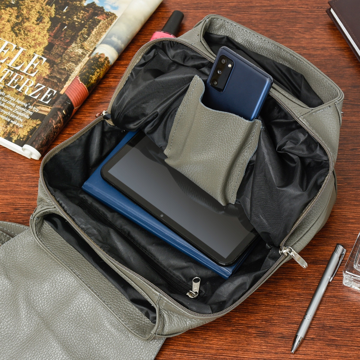 - Środkowa komora mieszcząca format B5 zamyka się na suwak i posiada dwie boczne kieszonki: otwartą, skórzaną na telefon oraz zasuwaną na inne drobne akcesoria