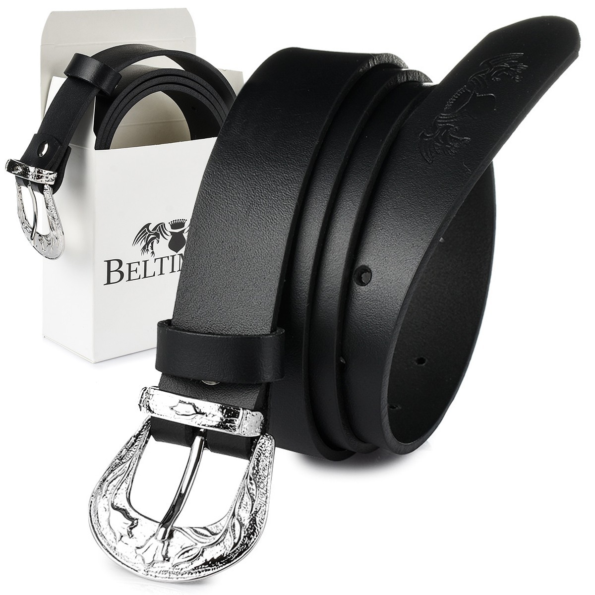 Piękny, skórzany, damski pasek do spodni marki Beltimore. Jest wytrzymały, solidny i w eleganckim, czarnym kolorze.