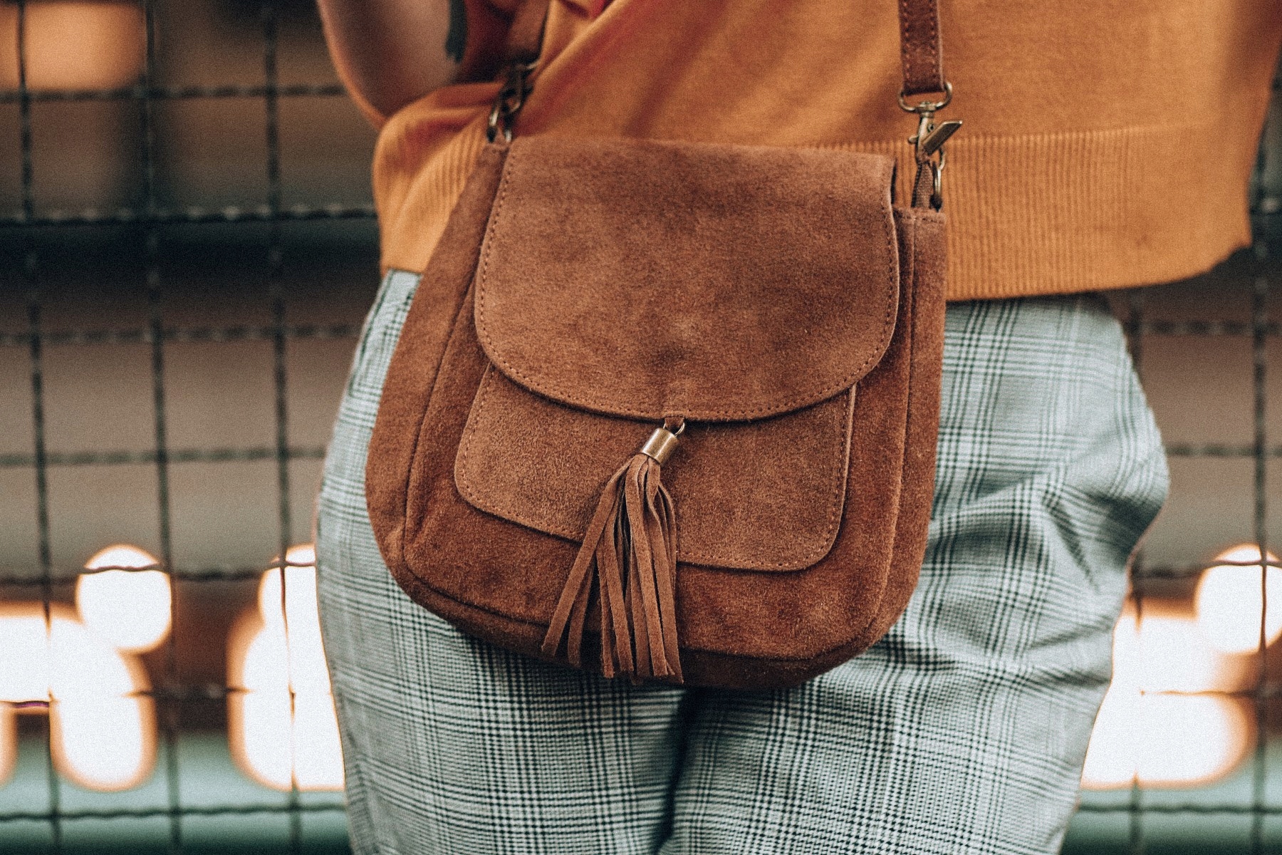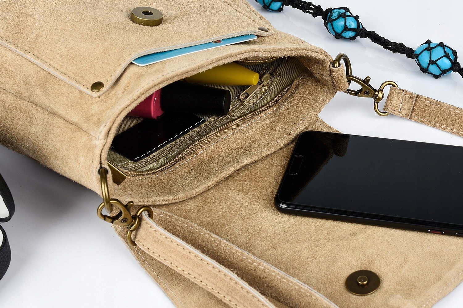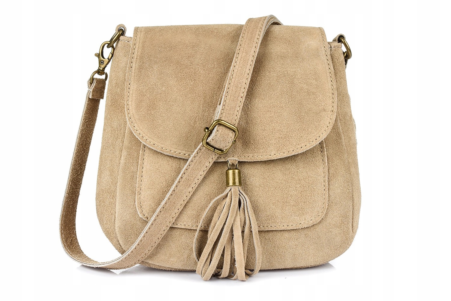 Skórzana, mała, zgrabna, zamszowa torebka listonoszka w kolorze beżowym.