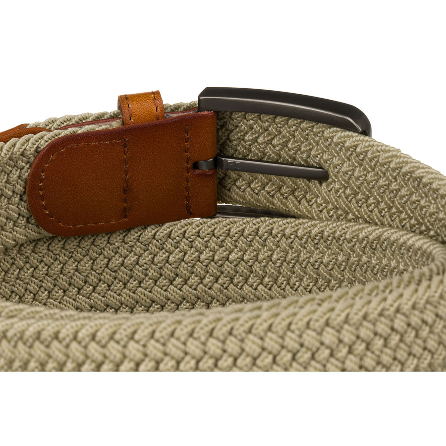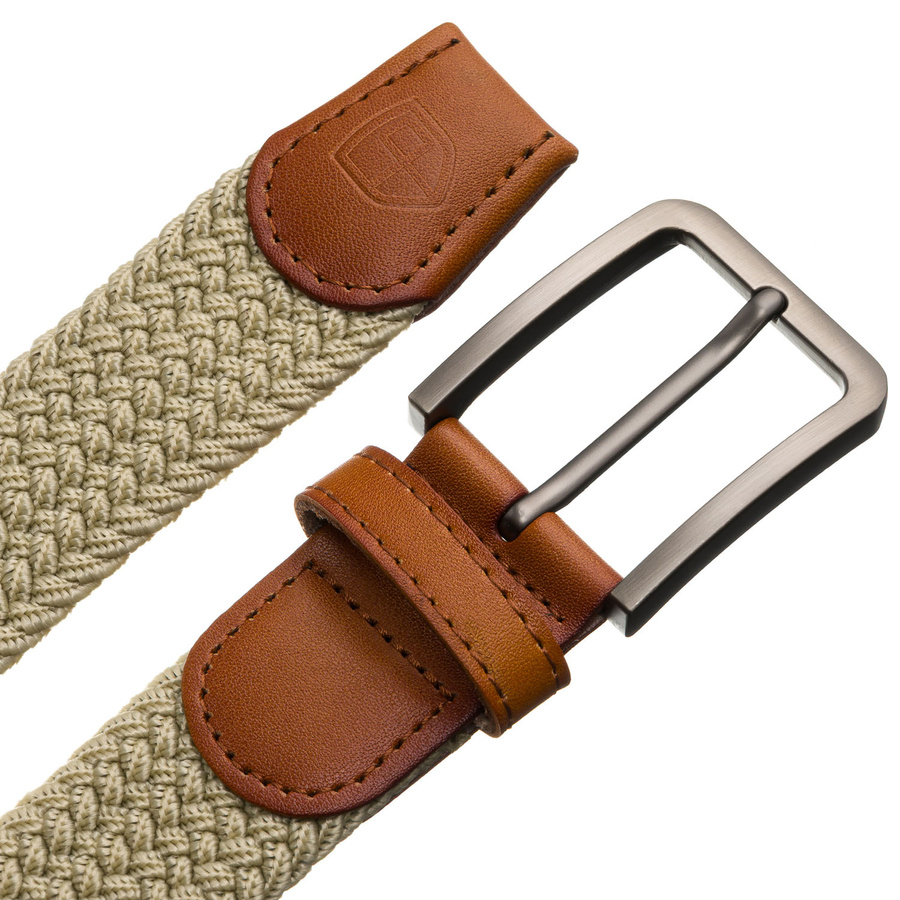 Pasek prezentuje elegancki i nowoczesny wygląd, dzięki plecionej strukturze w kolorze beżowym.