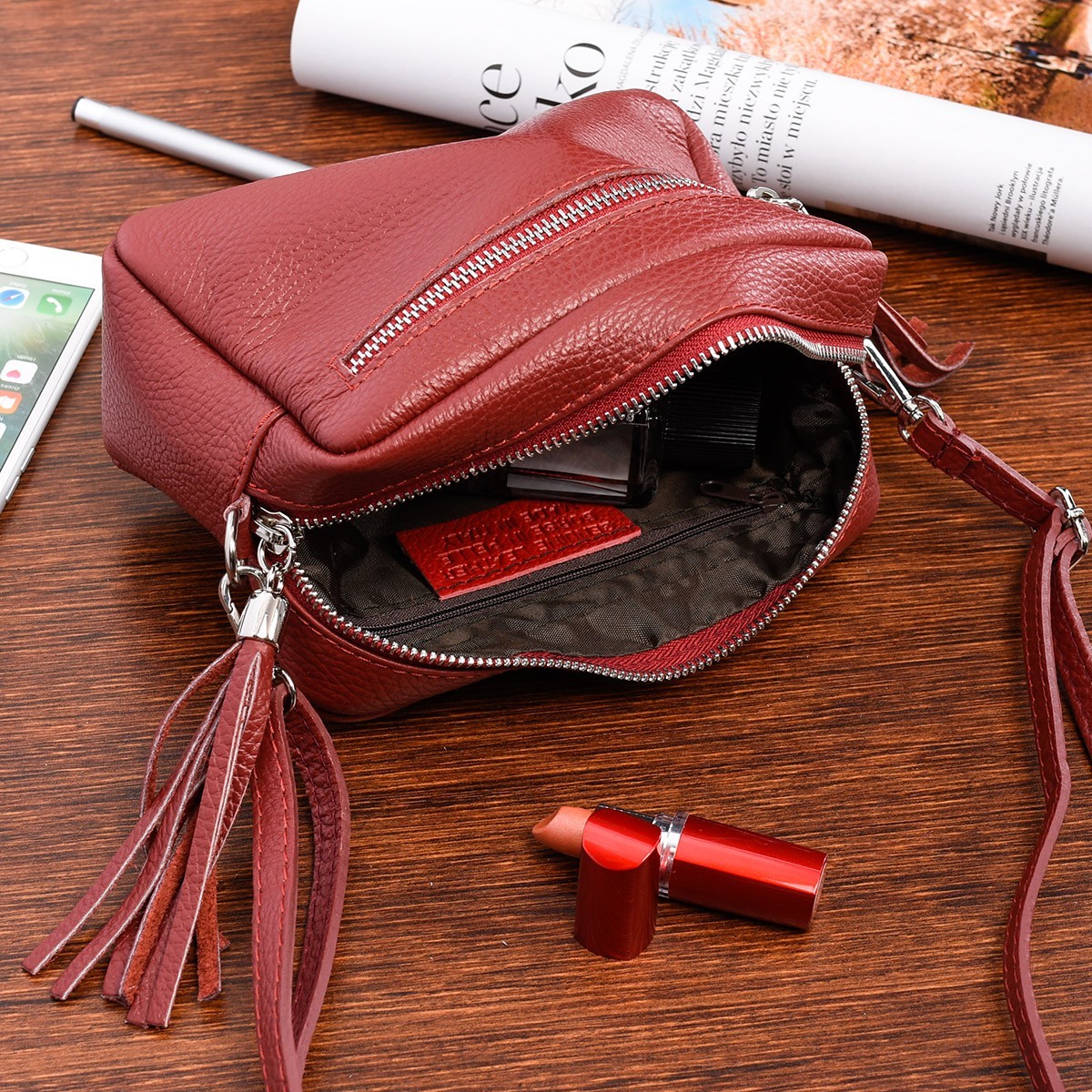 - Pomieści wszystkie najpotrzebniejsze podręczne rzeczy takie, jak portfel, telefon oraz inne drobiazgi