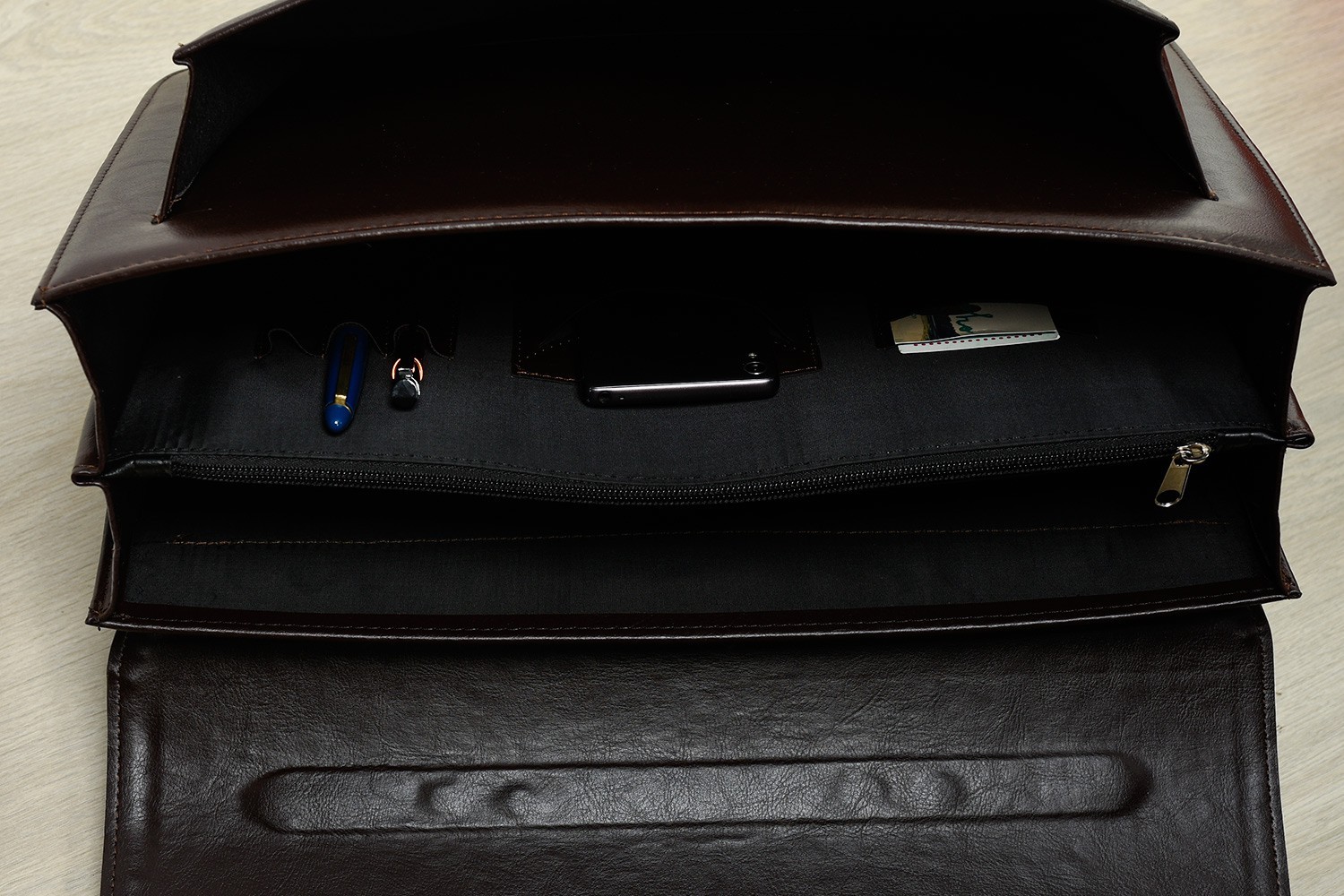 Cała teczka wyściełana jest podszewką, do tego aktówka wyposażona jest w solidny, wygodny, skórzany uchwyt do przenoszenia jej w dłoni.
