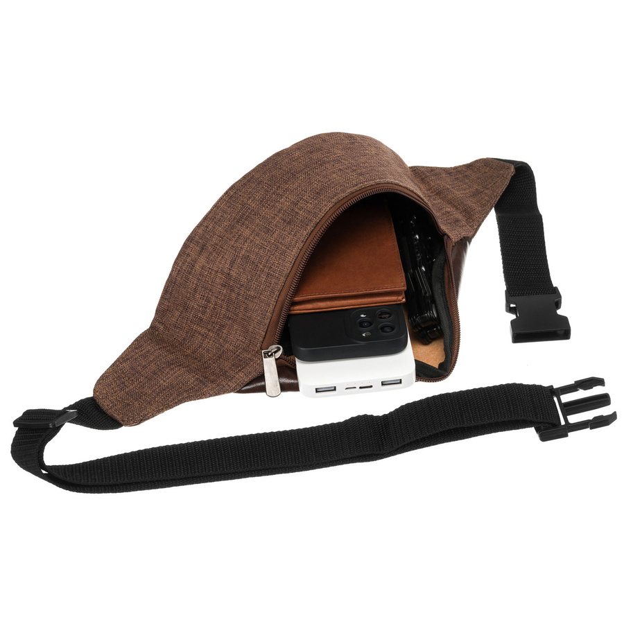 - Regulowany pasek, pozwalający dopasować saszetkę do sylwetki.