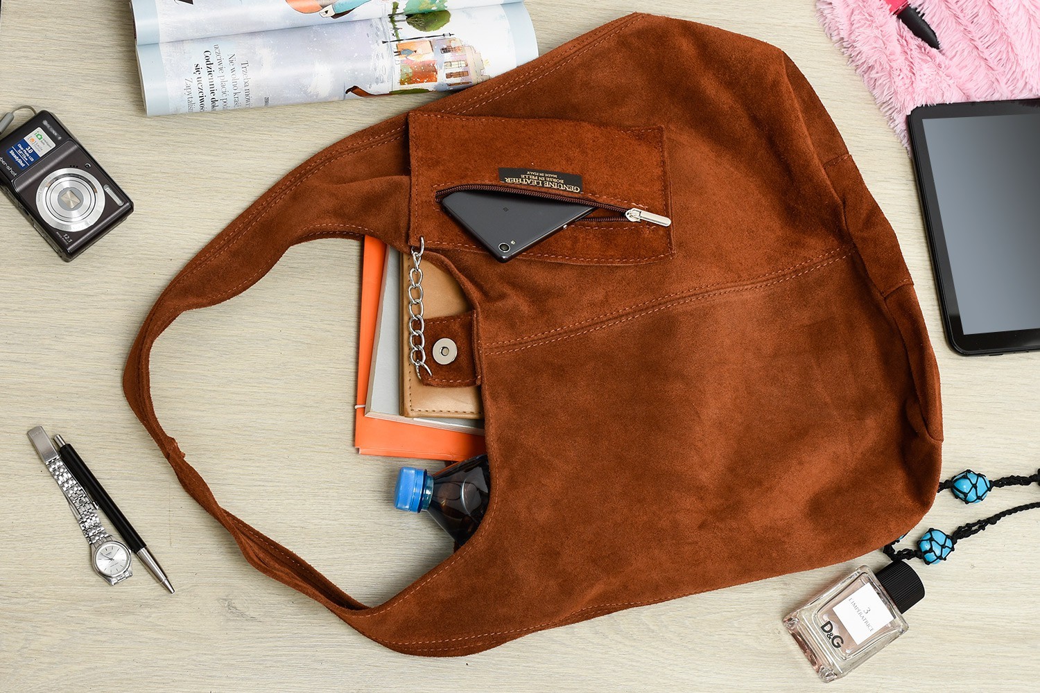 - Torebkę wyprodukowano we Włoszech z wysokiej jakości zamszowej skóry naturalnej