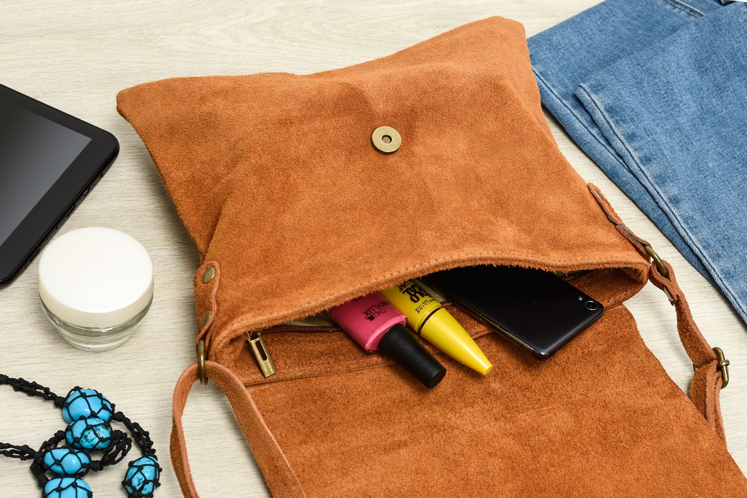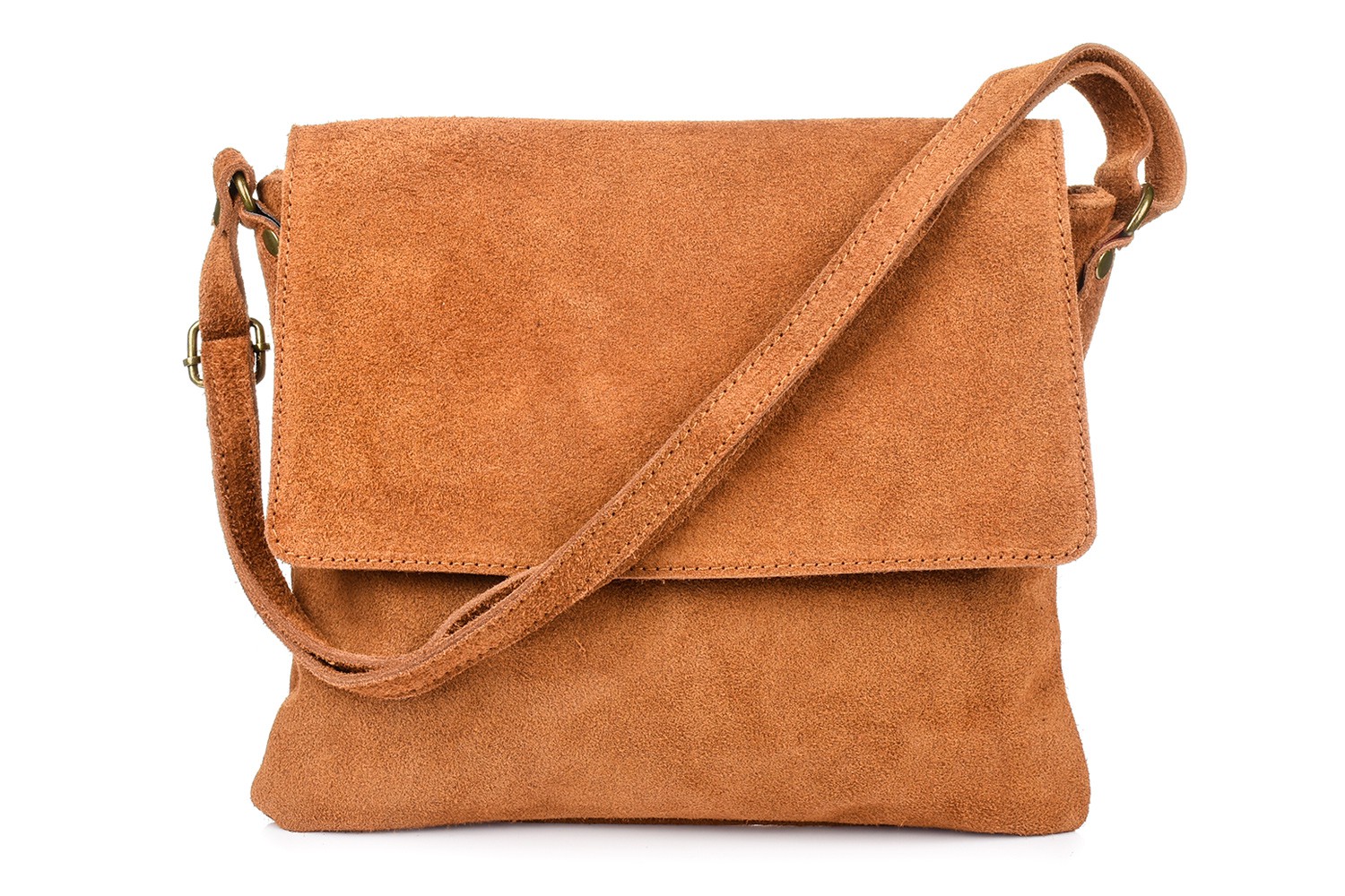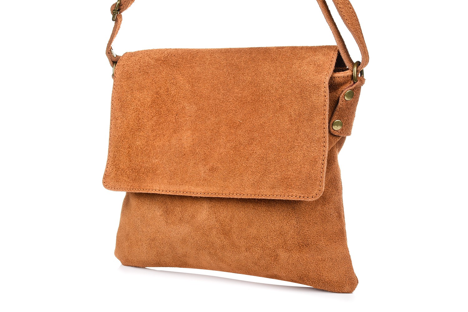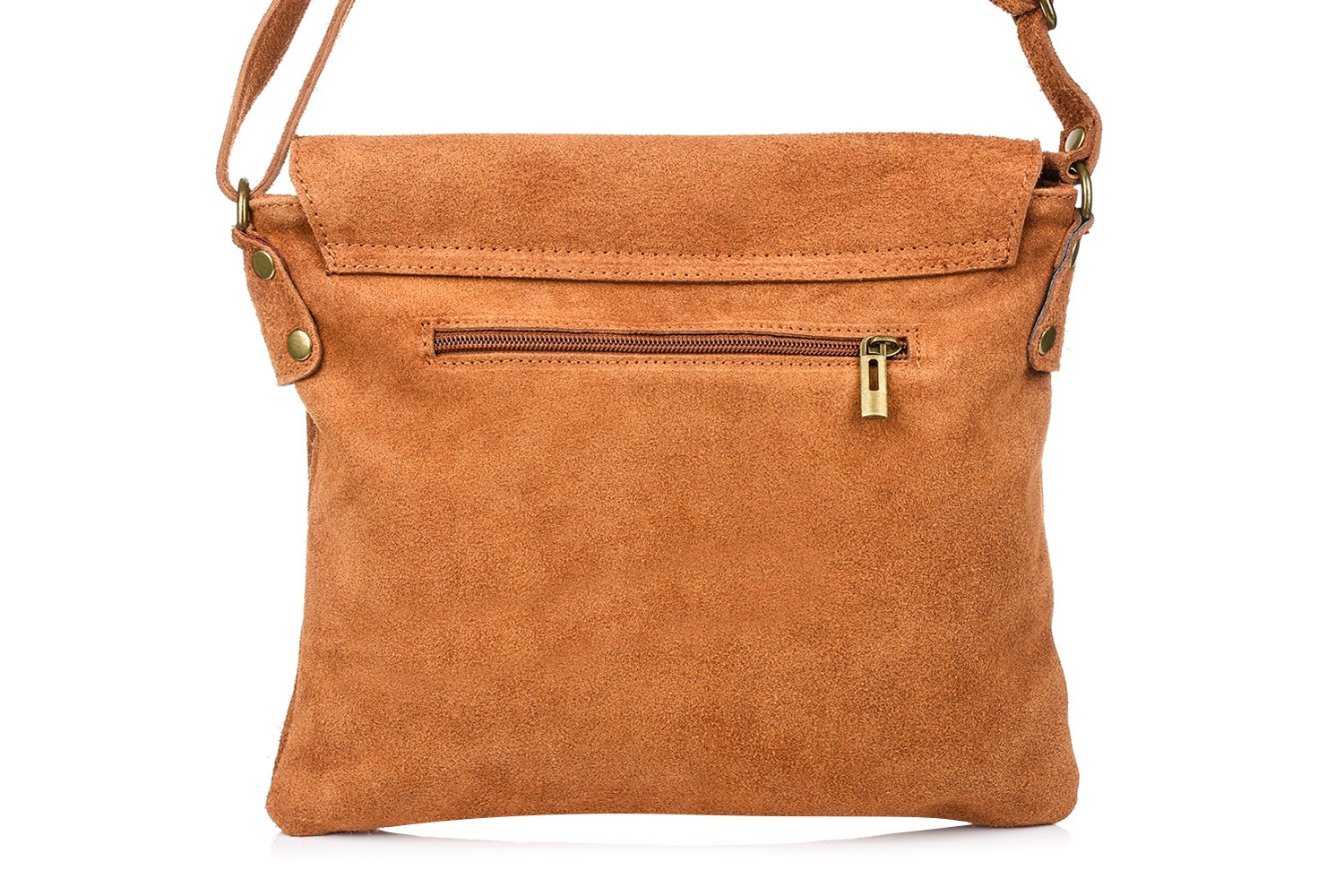 Camelowa listonoszka z klapą, zamszowa torebka damska, skórzana listonoszka B67
