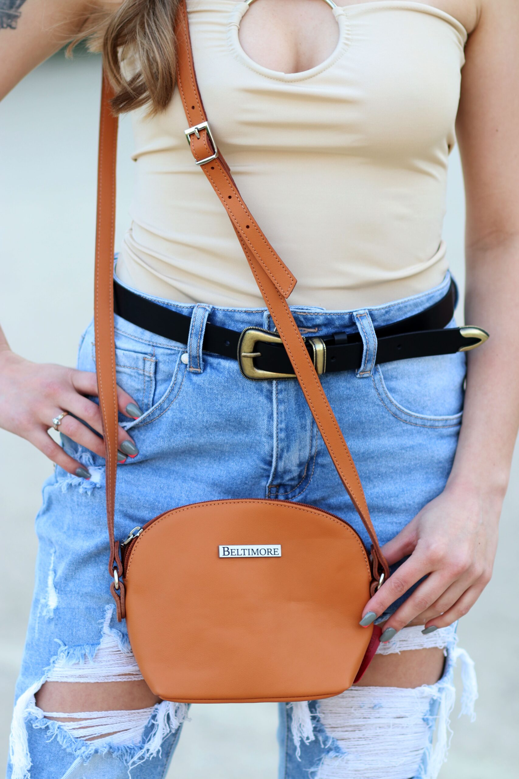 Camelowa mała damska torebka skórzana pasek Beltimore N22