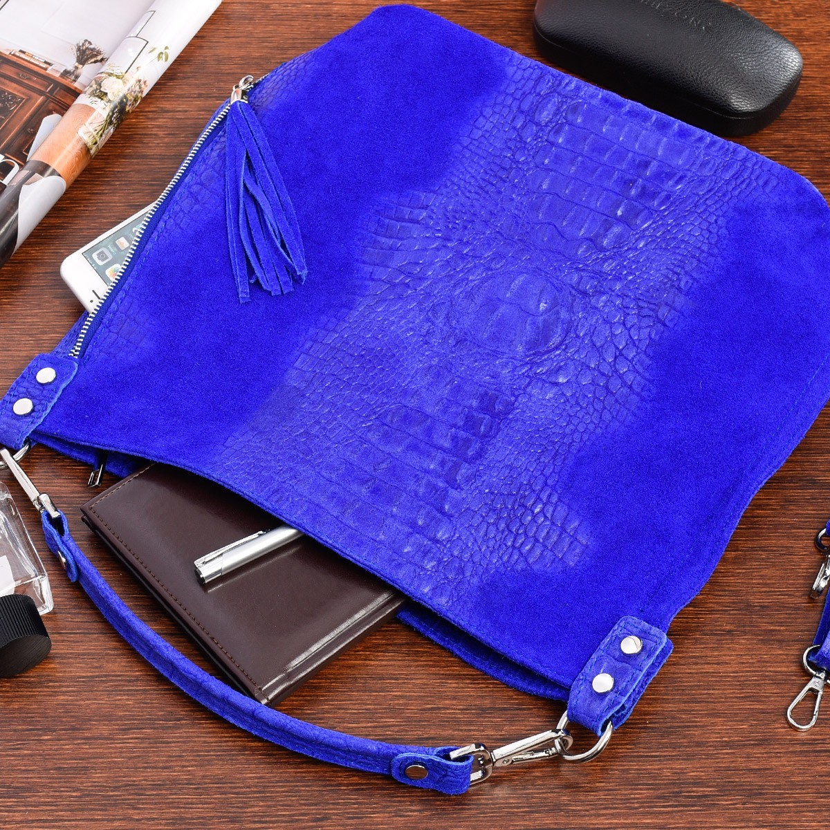 - Modną ozdobę stanowi również długi, zamszowy frędzel, będący brelokiem bocznej kieszonki torby