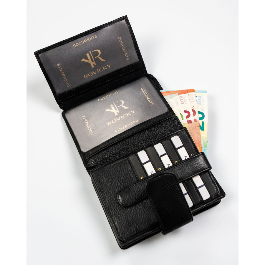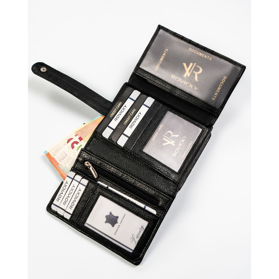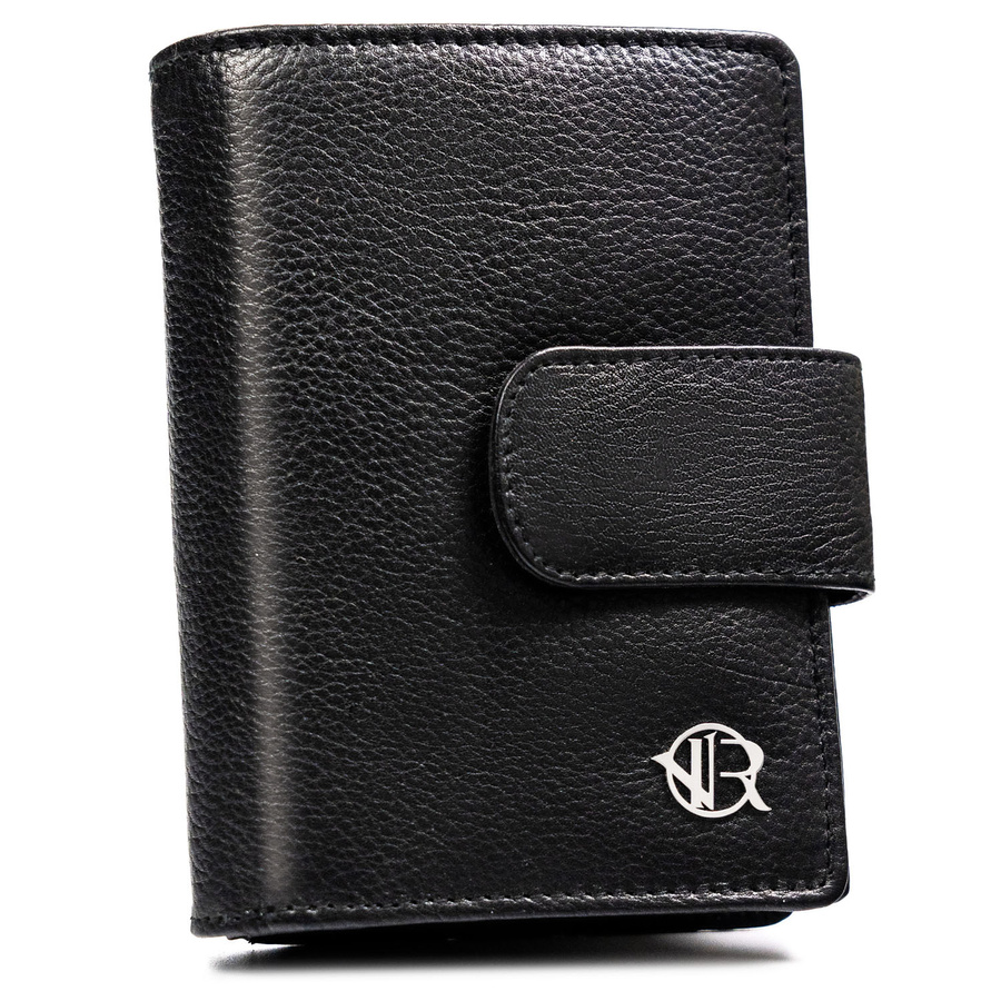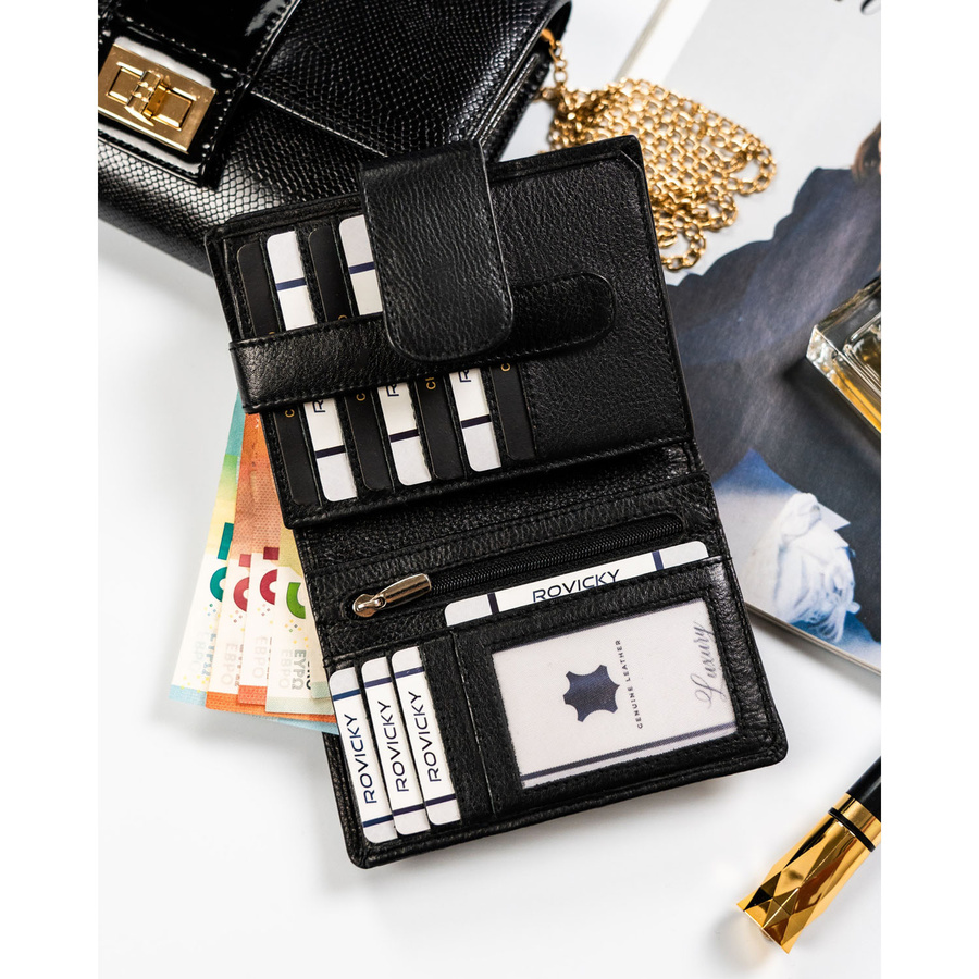 Czarny, skórzany portfel damski w orientacji pionowej zamykany na zatrzask – Rovicky