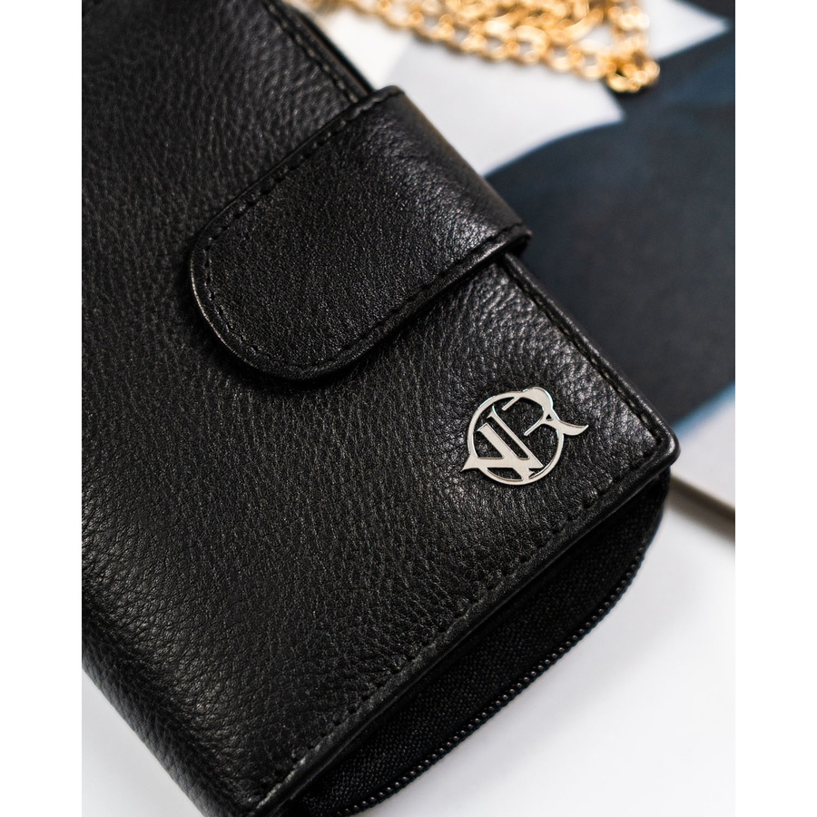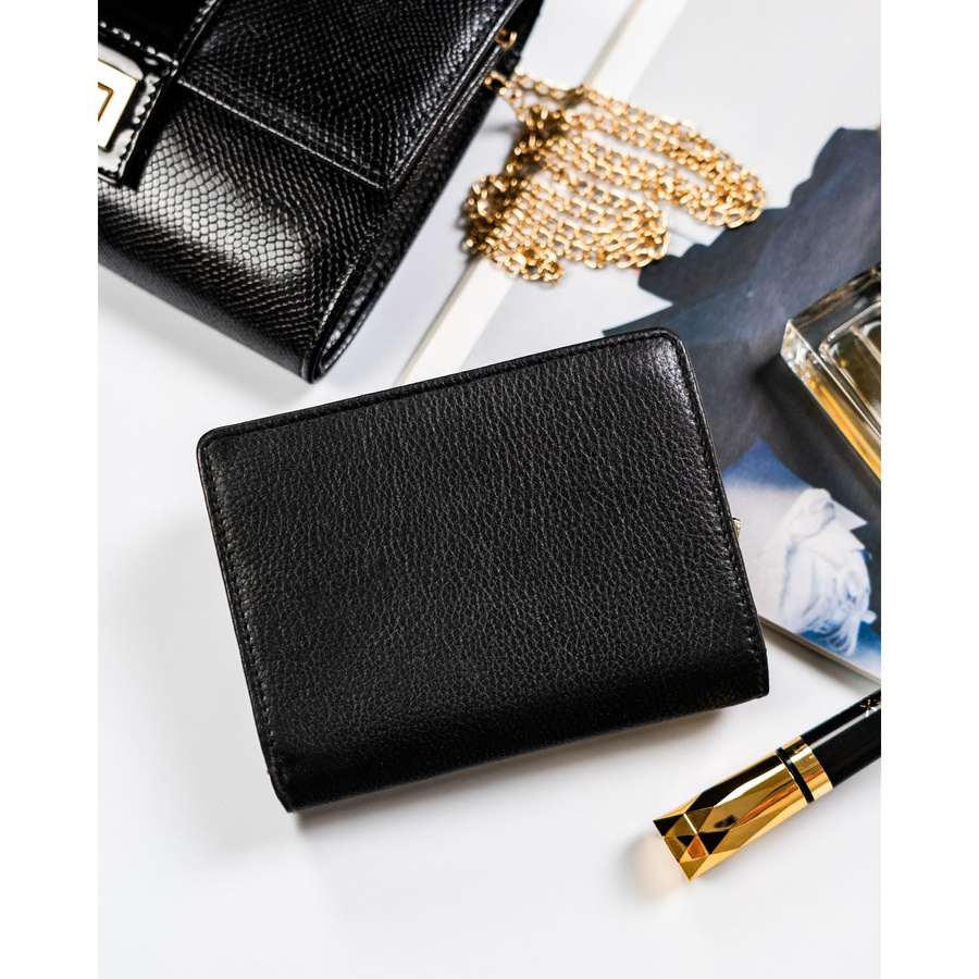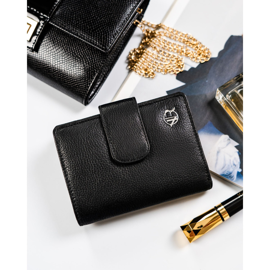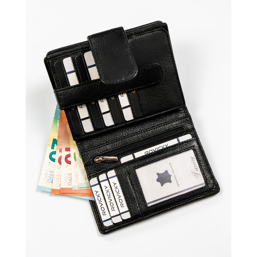 Czarny, skórzany portfel damski w orientacji pionowej zamykany na zatrzask – Rovicky