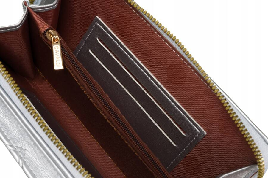 Banknoty schowasz do podwójnej kieszeni zapinanej na zamek. Dodatkowo przegródki oddziela schowek zapinany na suwak, który przeznaczony jest na bilon, lecz z powodzeniem zmieścisz tam, również dowód rejestracyjny. Oprócz tego wnętrze portfela wyposażono w 4 schowki na Twoje karty.