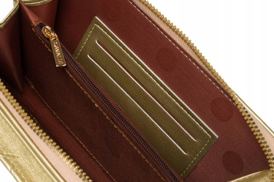 Banknoty schowasz do podwójnej kieszeni zapinanej na zamek. Dodatkowo przegródki oddziela schowek zapinany na suwak, który przeznaczony jest na bilon, lecz z powodzeniem zmieścisz tam, również dowód rejestracyjny. Oprócz tego wnętrze portfela wyposażono w 4 schowki na Twoje karty.
