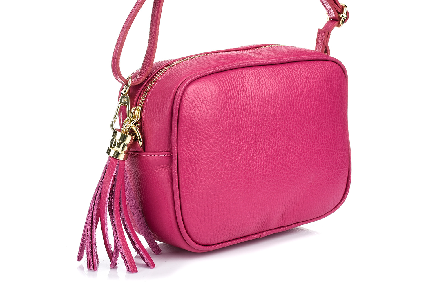Damska torebka listonoszka skórzana z frędzlem prostokątna włoska skóra fuksja P14