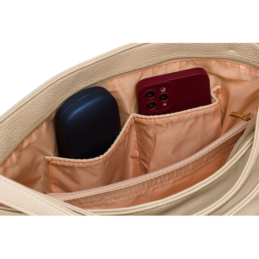 - 1 podwójną, przestronną komorę, w której znajdują się 2 otwarte przegródki o różnych rozmiarach oraz 2 zasuwane kieszenie.
