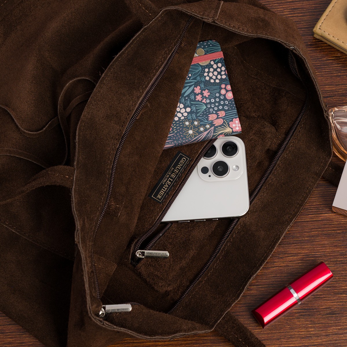 Torebka posiada dwie, niezależne, skórzane (zamszowe) rączki o długości około 54 cm, dzięki czemu można ją nosić w ręku jak i przez ramię