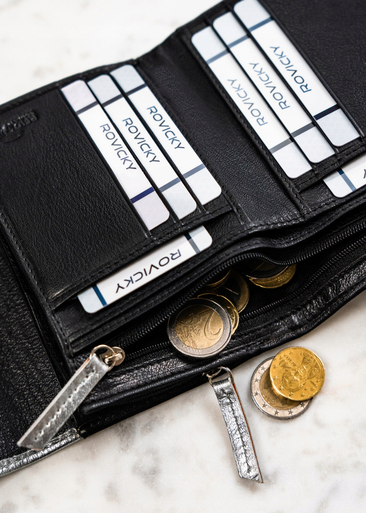 Portfel został zaprojektowany z myślą o zaspokojeniu wymagań zarówno zwolenników płatności elektronicznych, jak i osób ceniących tradycyjne metody. W środku znajduje się duża, podwójna kieszeń na bilon. Dzięki zamknięciu na zamek błyskawiczny kieszeń zapewnia bezpieczeństwo Twoich monet.