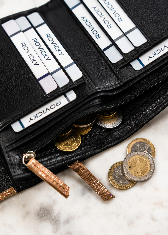 Portfel został zaprojektowany z myślą o zaspokojeniu wymagań zarówno zwolenników płatności elektronicznych, jak i osób ceniących tradycyjne metody. W środku znajduje się duża, podwójna kieszeń na bilon. Dzięki zamknięciu na zamek błyskawiczny kieszeń zapewnia bezpieczeństwo Twoich monet.