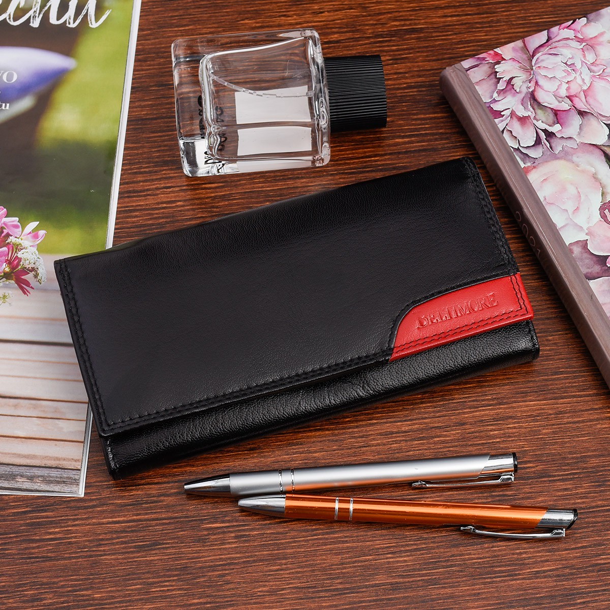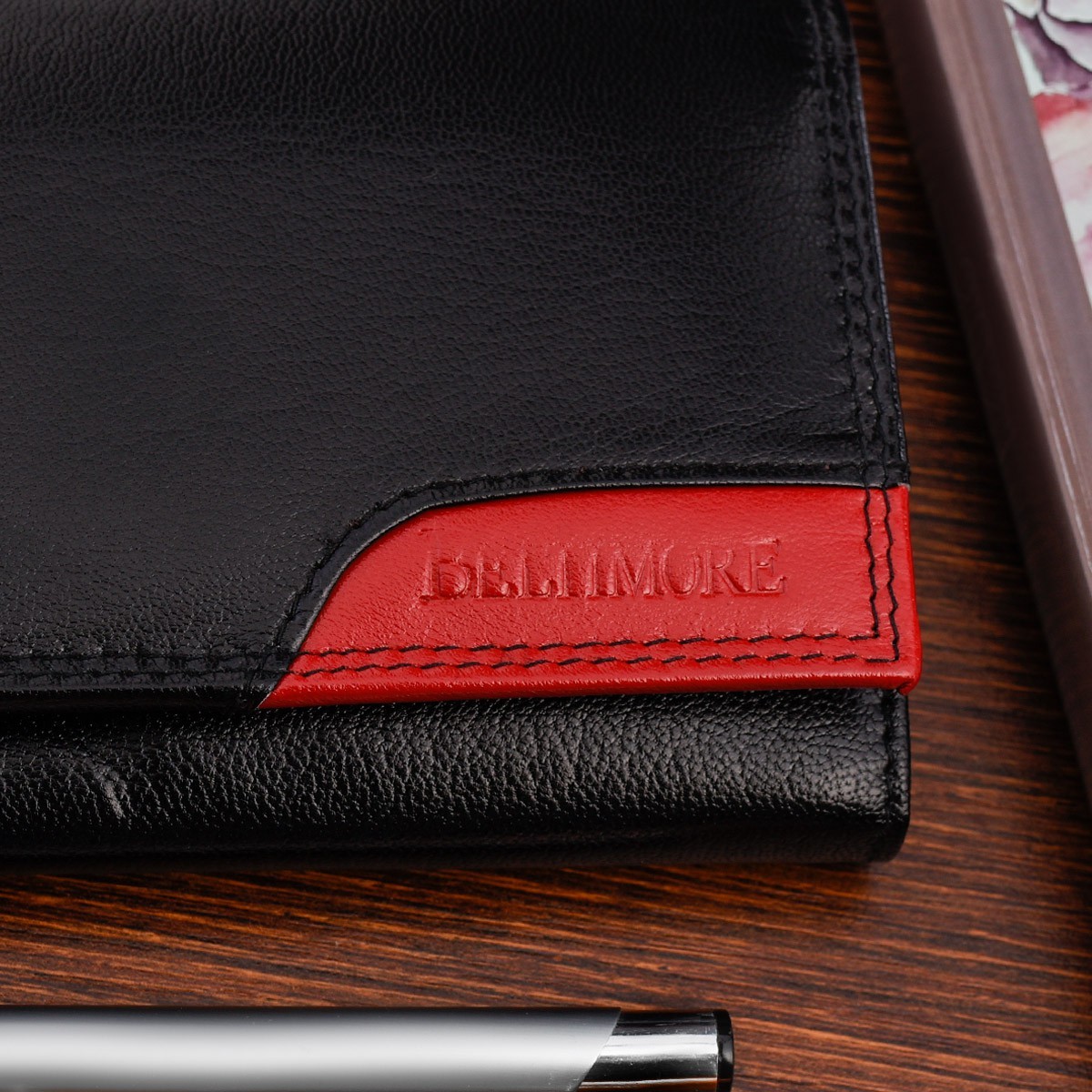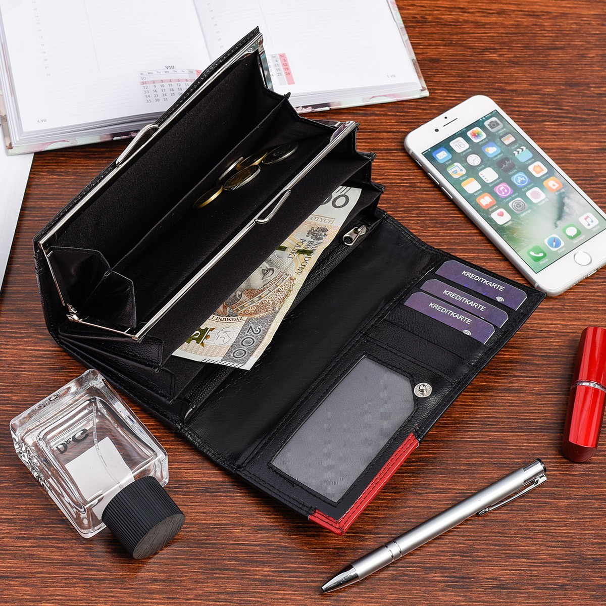 Duży, damski portfel wykonany w całości z bydlęcej skóry naturalnej w pięknym intensywnym, czarnym kolorze z kontrastową czerwoną wstawką. Zamykany jest na bigiel.