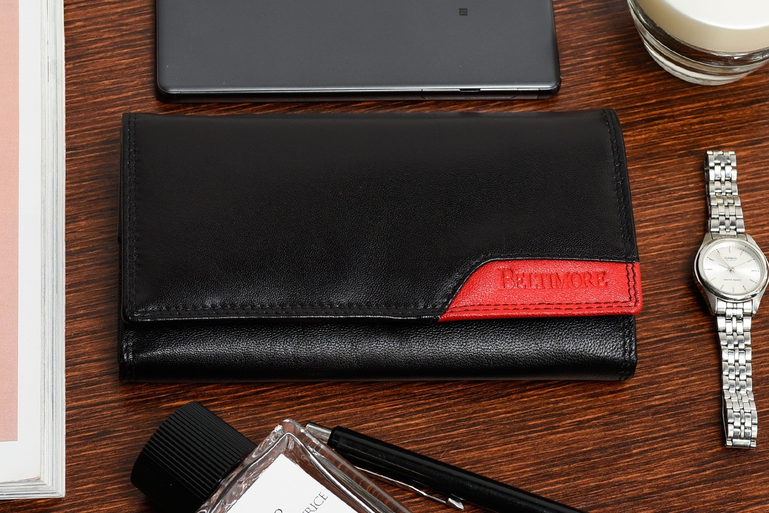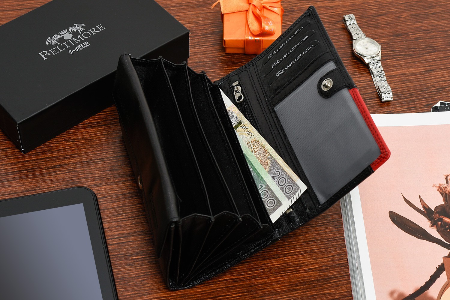 Piękny, skórzany, duży portfel marki Beltimore® w kobiecym stylu, w czarnym kolorze i elegancką czerwoną wstawką. Każdy portfel w środku ma dodatkowo retro komorę na zatrzask na drobne.