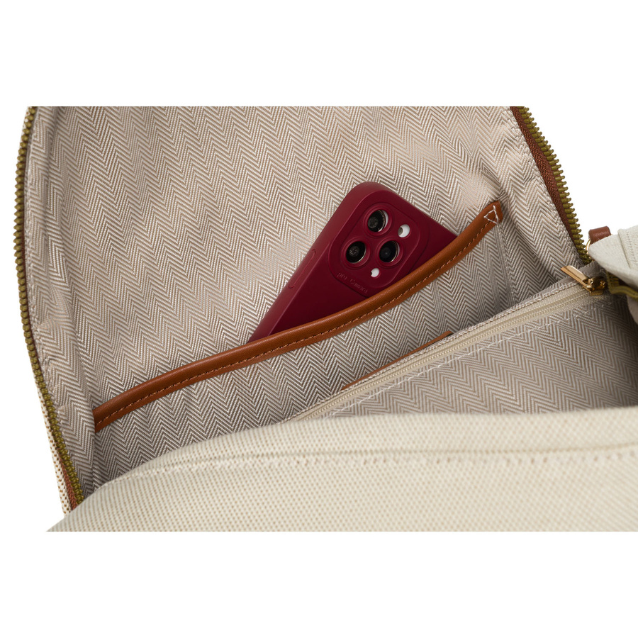 - Komora główna pomieści wszystkie niezbędne drobiazgi i większe rzeczy. W środku znajdują się 2 kieszenie – jedna otwarta, idealna na np. notes, i jedna zamykana na suwak, by bezpiecznie schować telefon czy dokumenty.