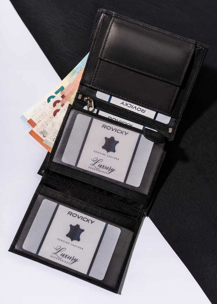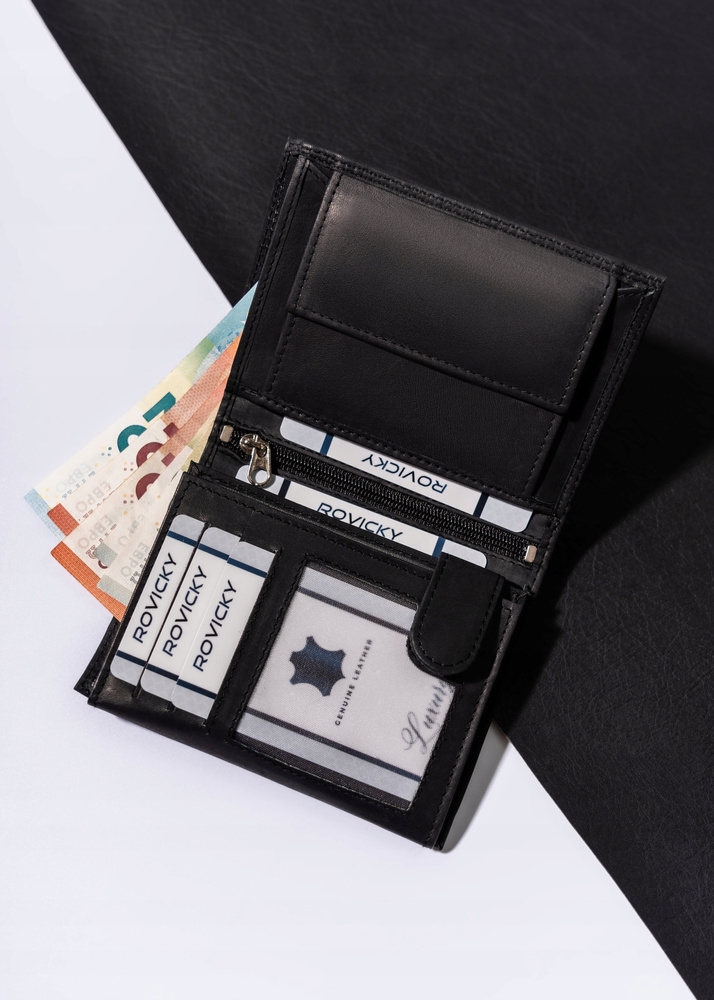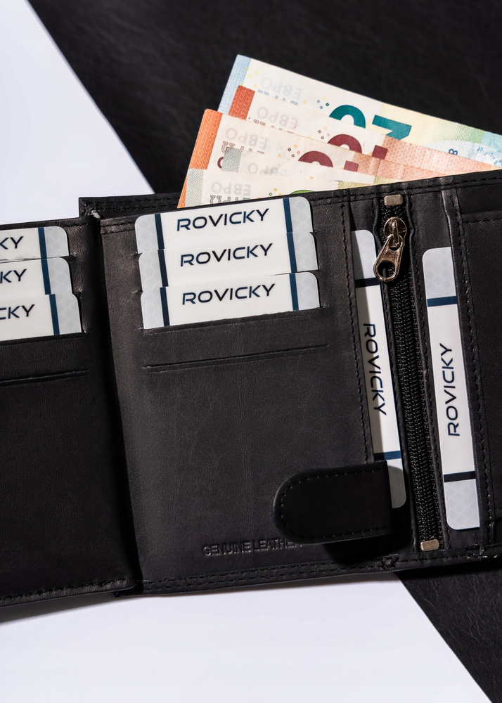 • Posiada również 2 przegródki na banknoty, które ułatwią segregacje pieniędzy. Kieszenie są na tyle pojemne, że bez problemu zmieszczą większe ilości banknotów.