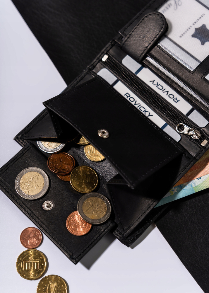 • 1 kieszonkę na monety zapinaną klapką na zatrzask, która pozwala bezpiecznie przechowywać monety. Jej odpowiednio przemyślana konstrukcja sprawia, że wyciąganie z niej drobnych jest bardzo komfortowe.