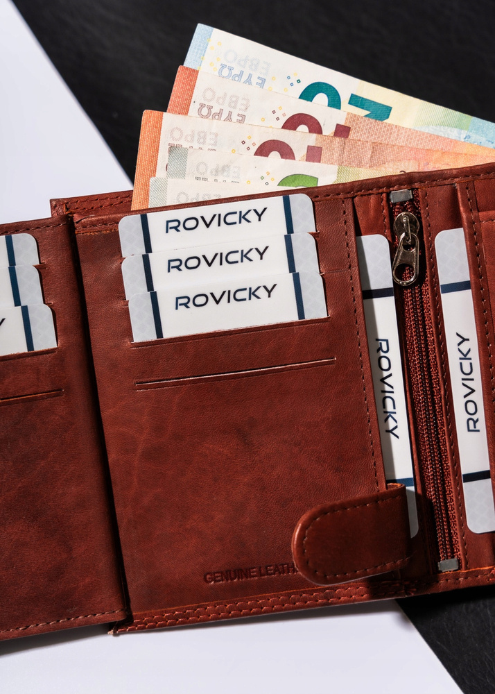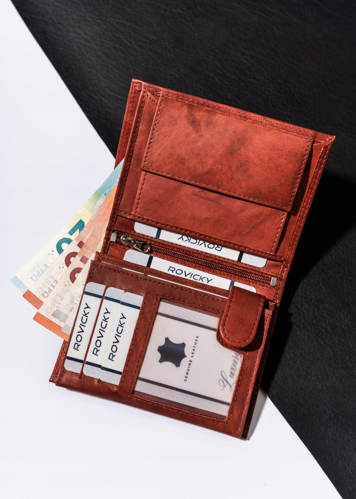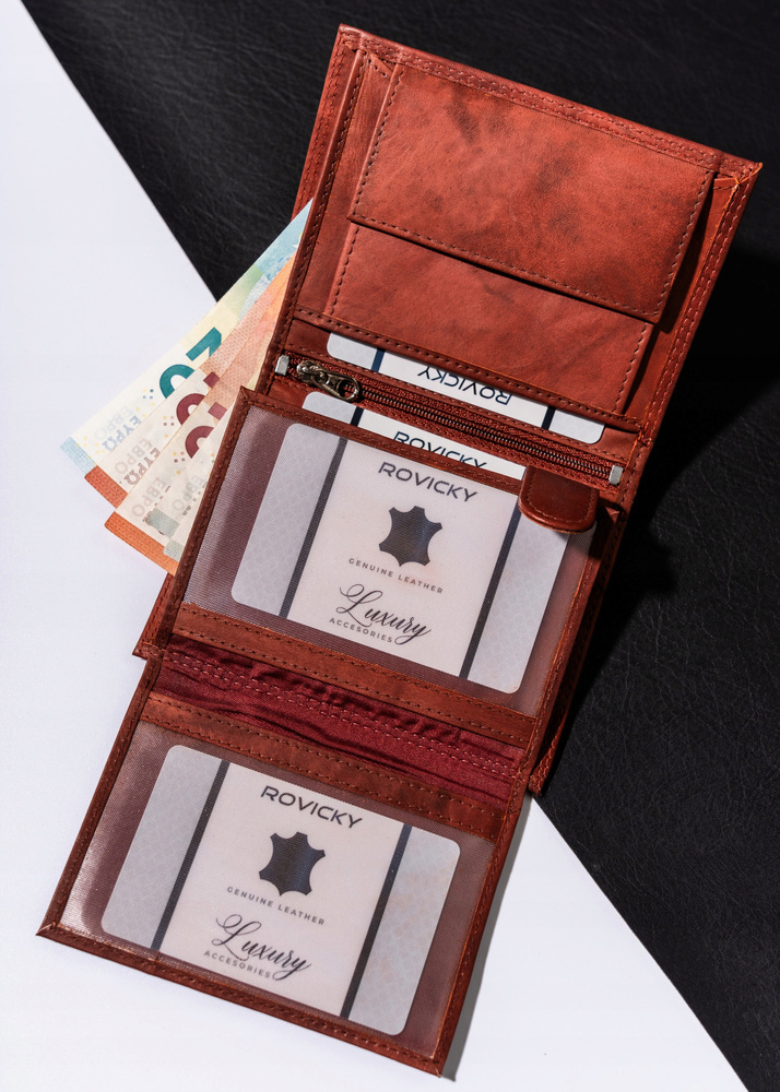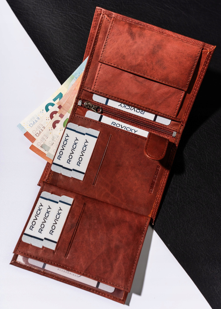 - Posiada również 2 przegródki na banknoty, które ułatwią segregacje pieniędzy. Kieszenie są na tyle pojemne, że bez problemu zmieszczą większe ilości banknotów.