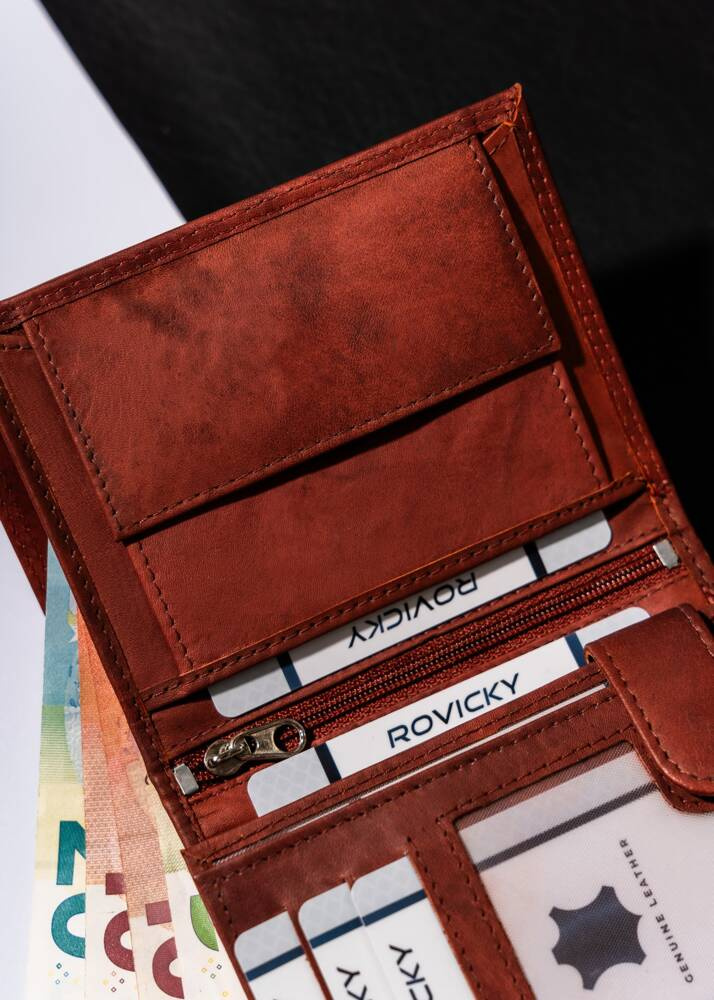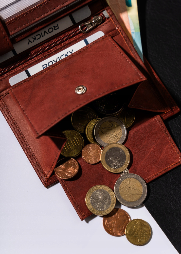 - 1 kieszonkę na monety zapinaną klapką na zatrzask, która pozwala bezpiecznie przechowywać monety. Jej odpowiednio przemyślana konstrukcja sprawia, że wyciąganie z niej drobnych jest bardzo komfortowe.
