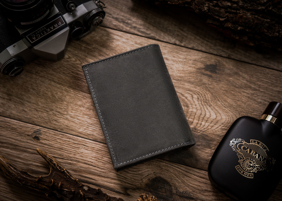Portfel odszyty z trwałej nubukowej skóry naturalnej. Model o klasycznej stylistyce. Portfel w orientacji pionowej, bez zapięcia zewnętrznego