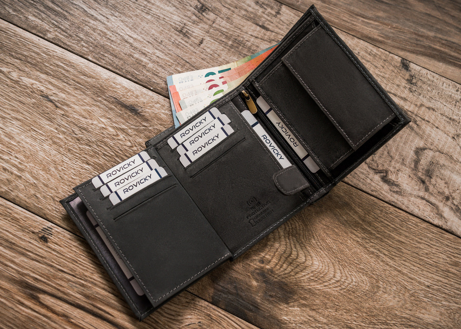 - banknoty schowasz do 2 otwartych, szerokich przegródek, wykończonych materiałową podszewką.