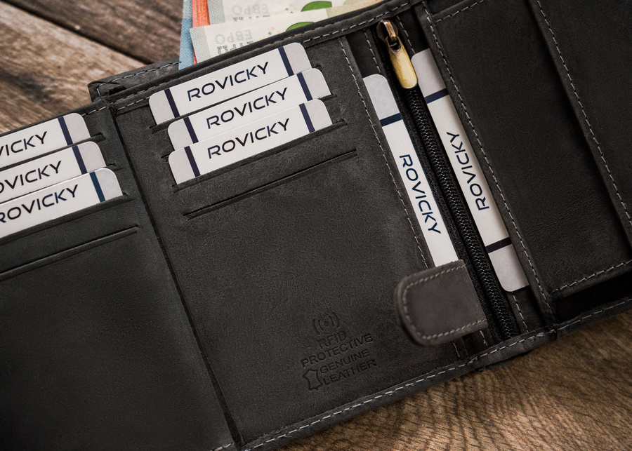 Wyposażony w technologię RFID BLOCKING SYSTEM, która zabezpiecza karty zbliżeniowe, dokumenty biometryczne, legitymacje i karty komunikacji miejskiej przed nieautoryzowanym odczytem danych.