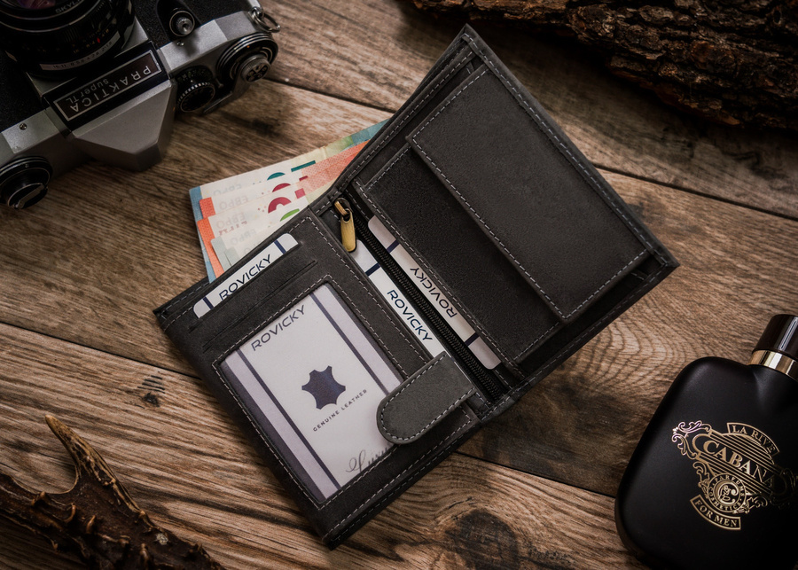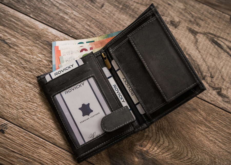 Posiada rozbudowane wnętrze – będzie idealnym wyborem właśniedla Ciebie idealny, jeżeli na co dzień nosisz dokumenty w dużym formacie jak np. dowód rejestracyjny. Ponadto zmieścisz w nim pokaźne ilości kart oraz gotówki.