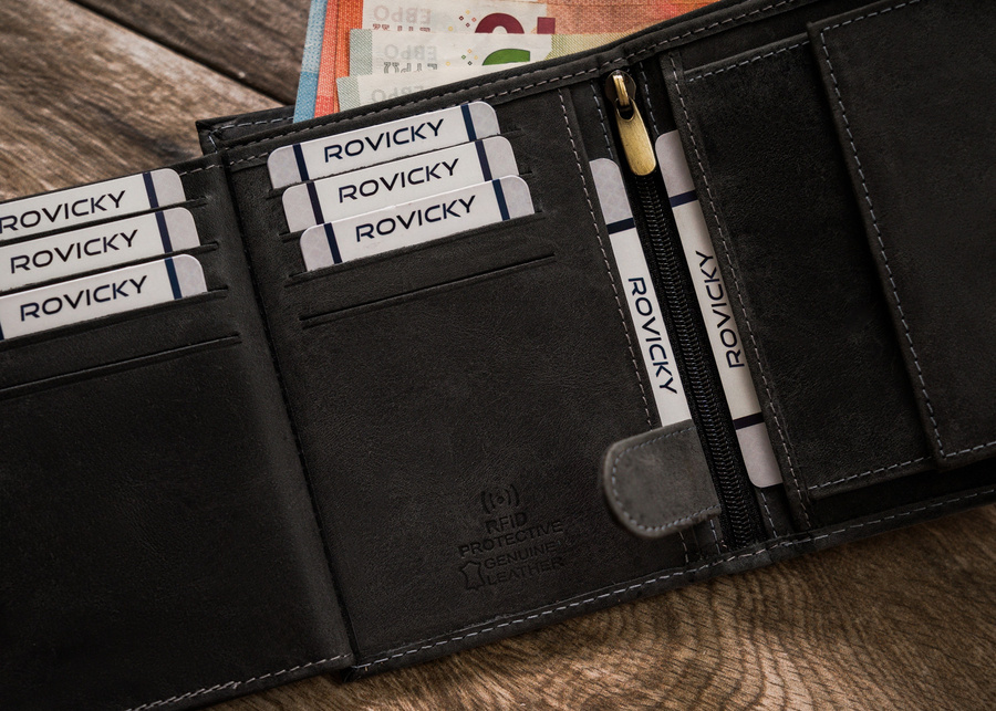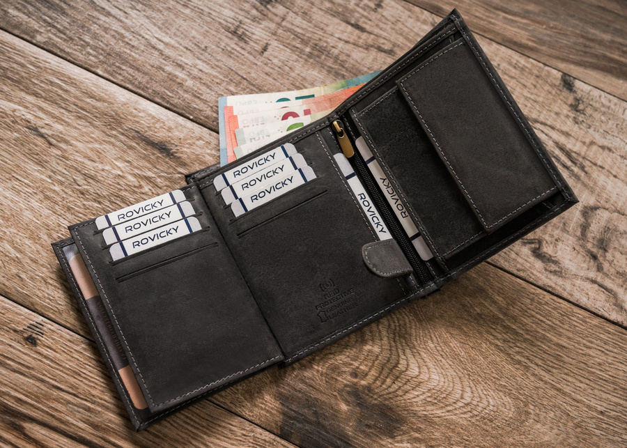 Wyposażony w technologię RFID BLOCKING SYSTEM, która zabezpiecza karty zbliżeniowe, dokumenty biometryczne, legitymacje i karty komunikacji miejskiej przed nieautoryzowanym odczytem danych.