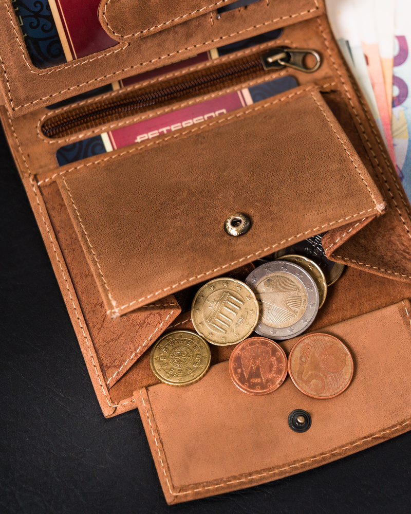 - banknoty schowasz do 2 otwartych, szerokich przegródek, wykończonych materiałową podszewką.