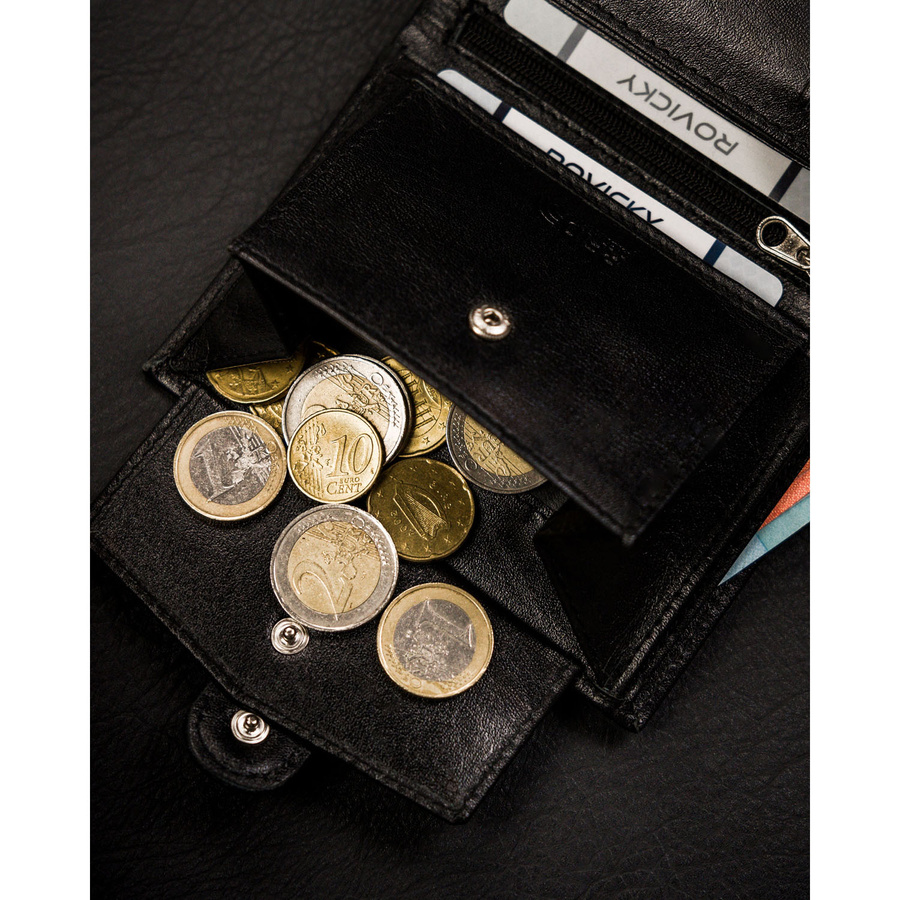 - Funkcjonalność portfela uzupełnia pojemna kieszeń na bilon, zapinana na klasyczny zatrzask – nie wysypie się z niej nawet najmniejsza moneta.
