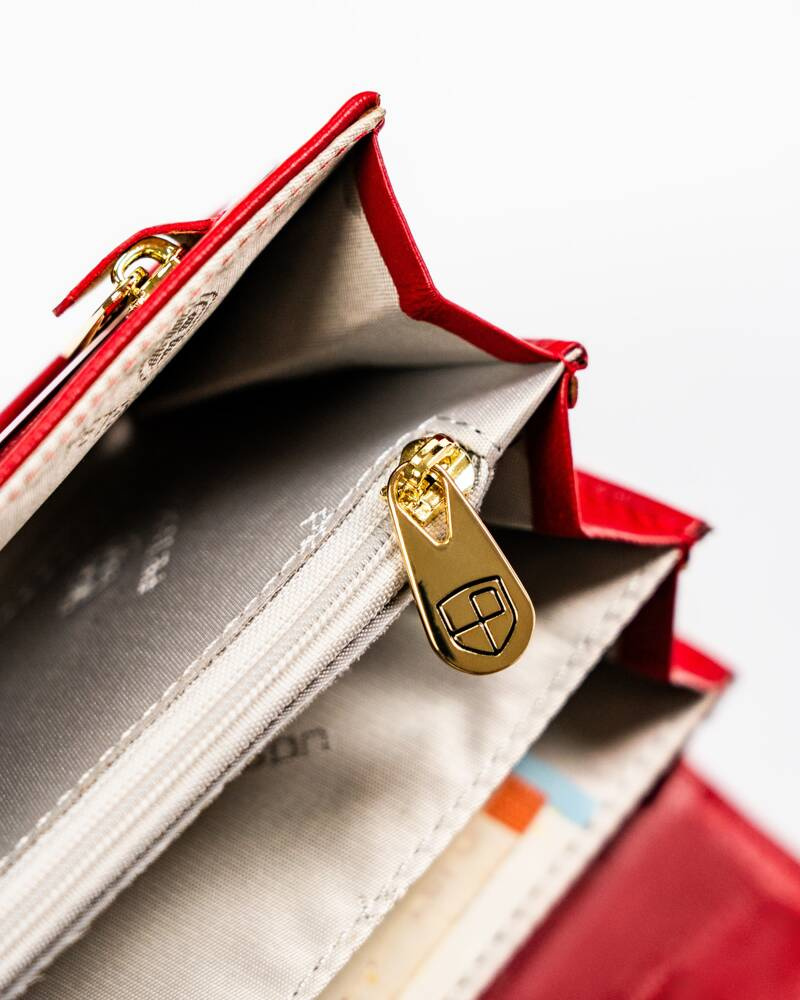- 1 praktyczny schowek na suwak wyszyty z przodu portfela.