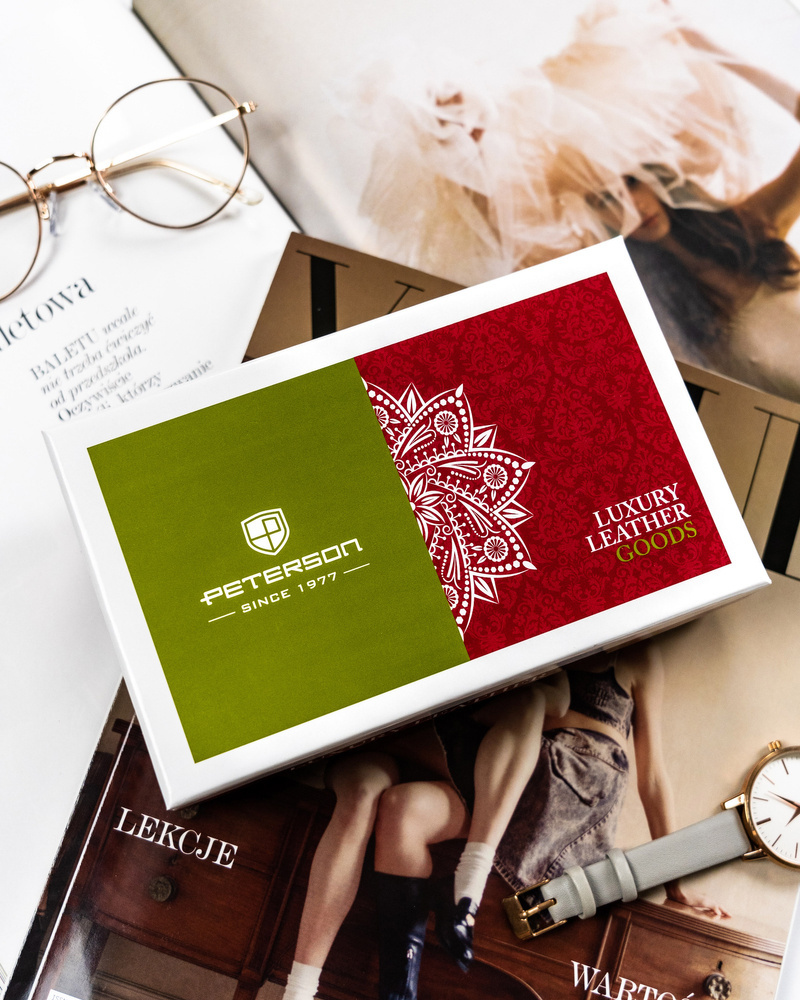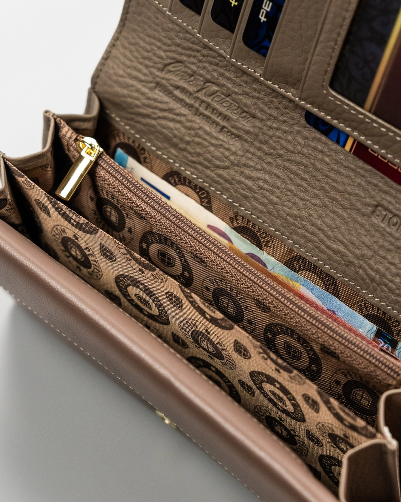 - 2 schowki na duże dokumenty. Jeden ze schowków mieści się po zewnętrznej stronie portfela, z tyłu;