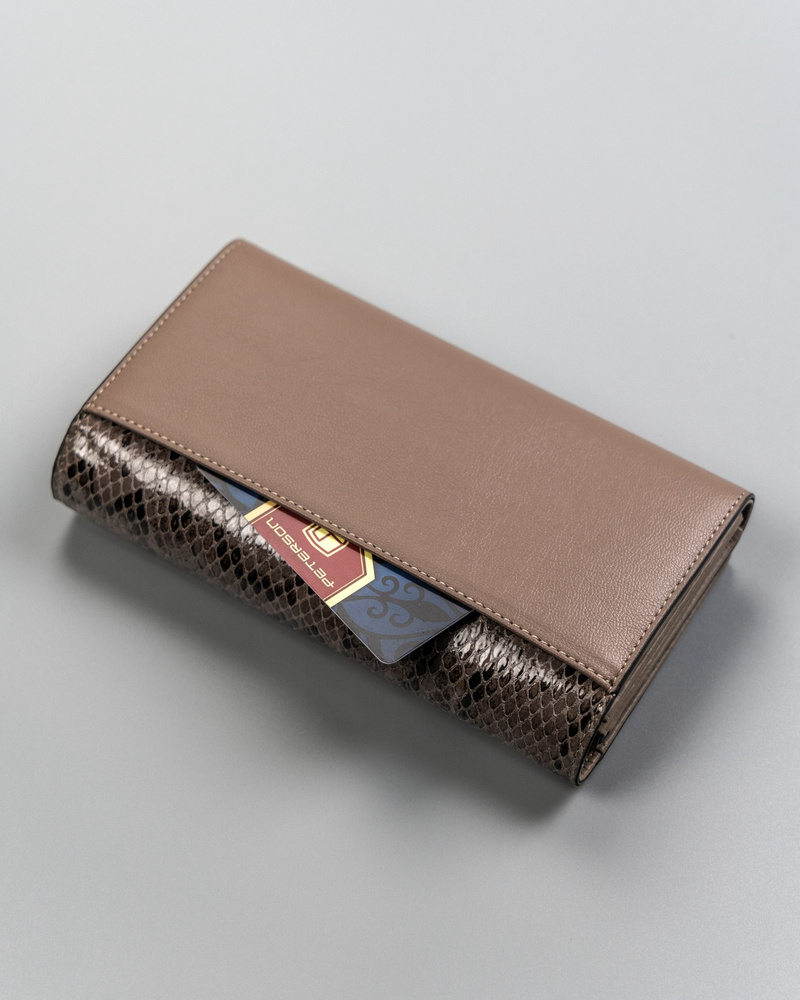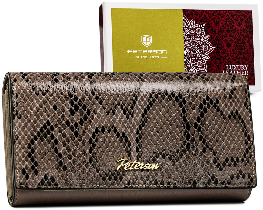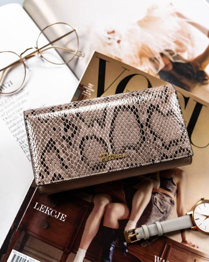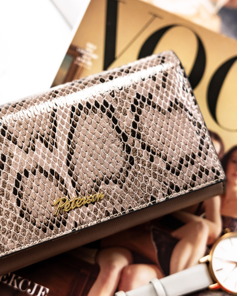 - Rewelacyjny design | Portfel o klasycznym fasonie i najmodniejszym wzorze skóry węża. Model w orientacji poziomej zapinany klapką na zatrzask.