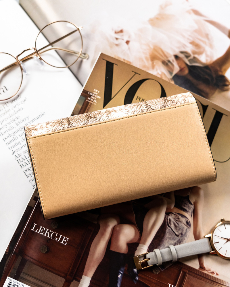 - Rewelacyjny design | Portfel o klasycznym fasonie i najmodniejszym wzorze skóry węża. Model w orientacji poziomej zapinany klapką na zatrzask.