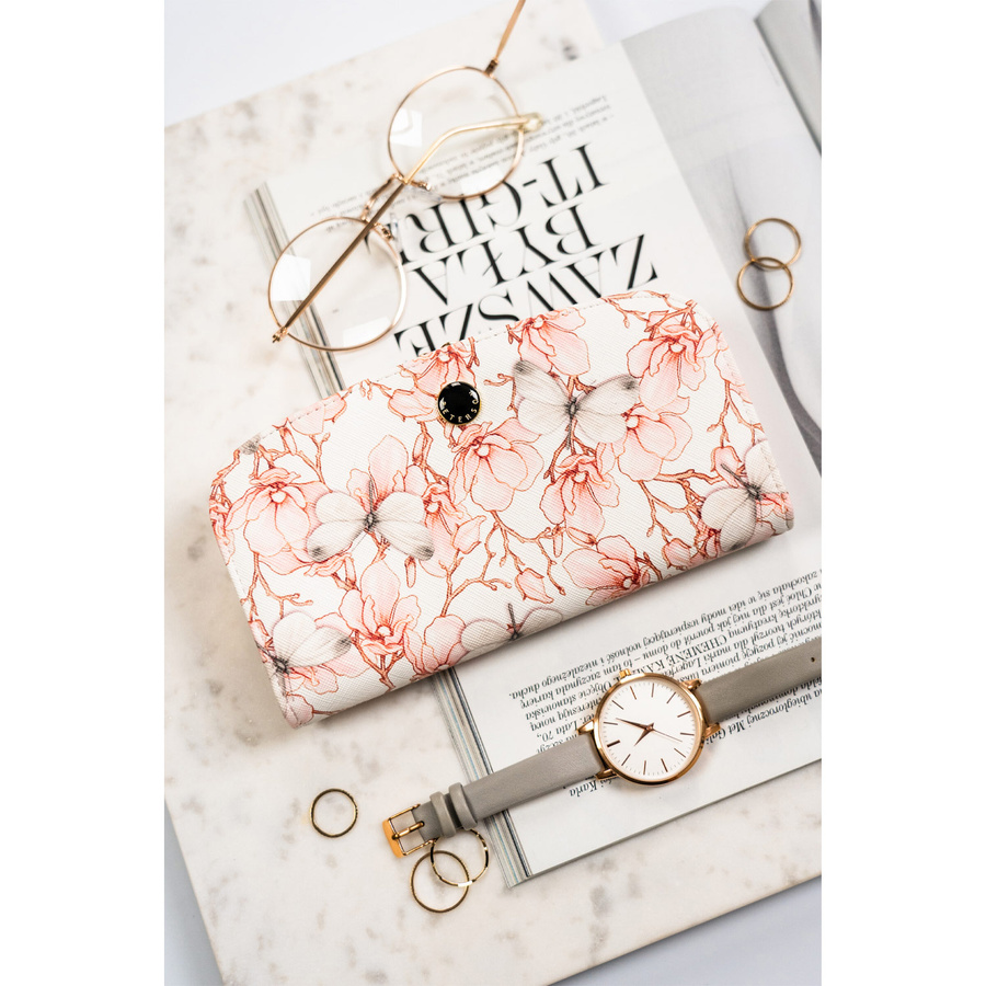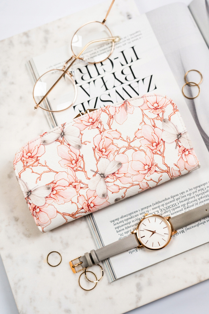 - Materiał i design | Portfel został uszyty z wytrzymałej skóry ekologicznej ozdobionej pięknym, kwiatowym motywem;