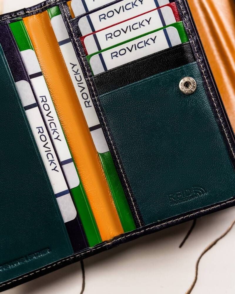 - 6 kieszonek na dokumenty w większym formacie, jak dowód rejestracyjny w okładce. Jedna z tych kieszonek mieści się po zewnętrznej części, z tyłu portfela, zamykana jest na zameczek;