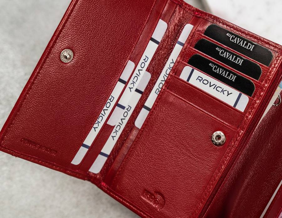 • 6 kieszonek na dokumenty w większym formacie, jak dowód rejestracyjny w okładce. Jedna z tych kieszonek mieści się po zewnętrznej części, z tyłu portfela, zamykana jest na zameczek;