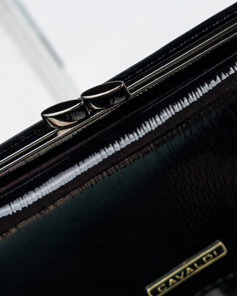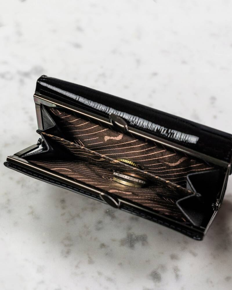 - Klasyczny fason | Portfel w ponadczasowym stylu i pięknym czarnym kolorze! Model w całości lakierowany. Pod warstwą lakieru, klapkę zdobi prążkowana faktura;