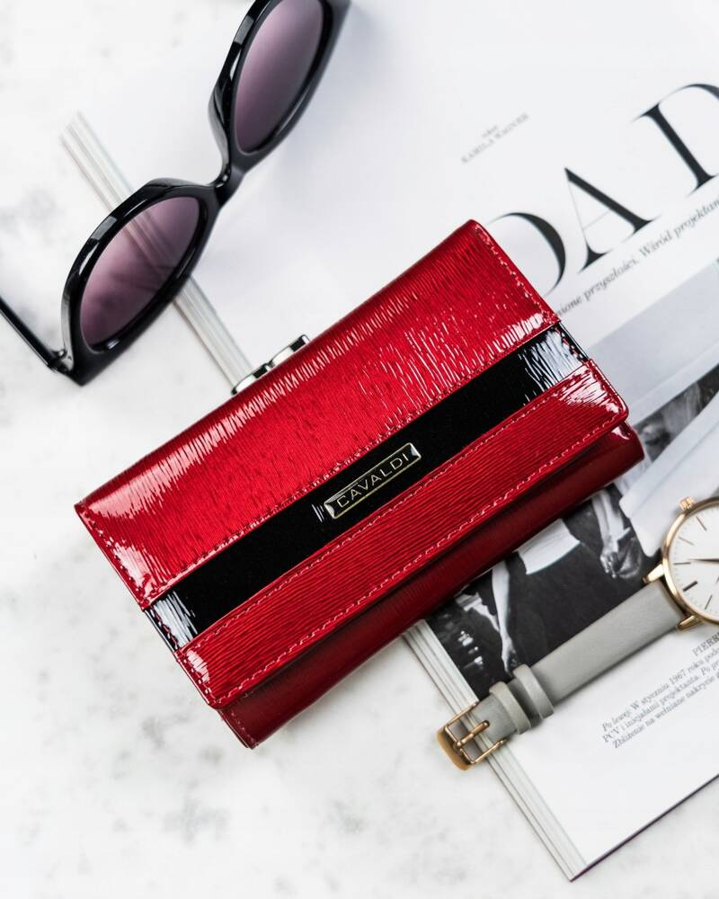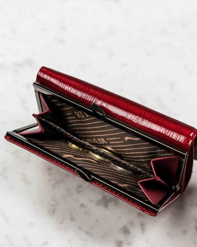 - Klasyczny fason z pięknym tłoczeniem | Skóra portfela po stronie zewnętrznej jest lakierowana. Zamykany klapką na zatrzask. Front ozdobiony tłoczonym logo marki;