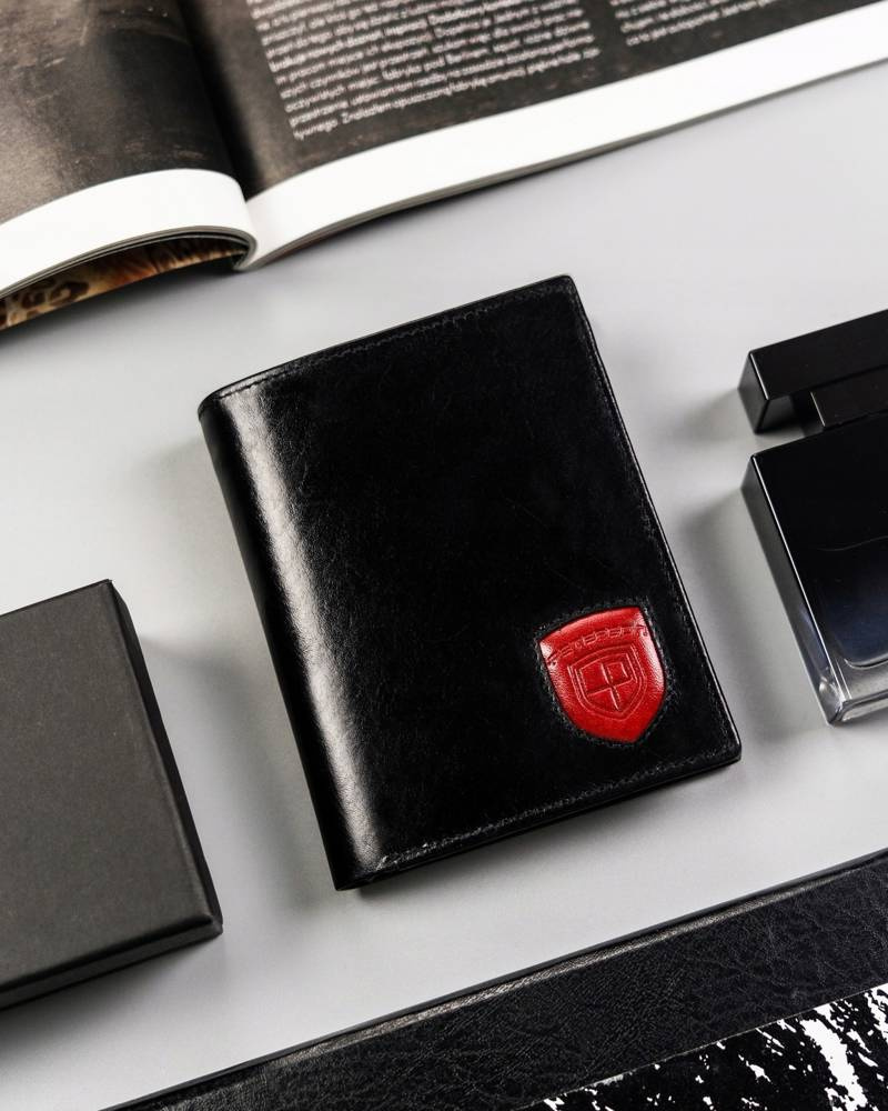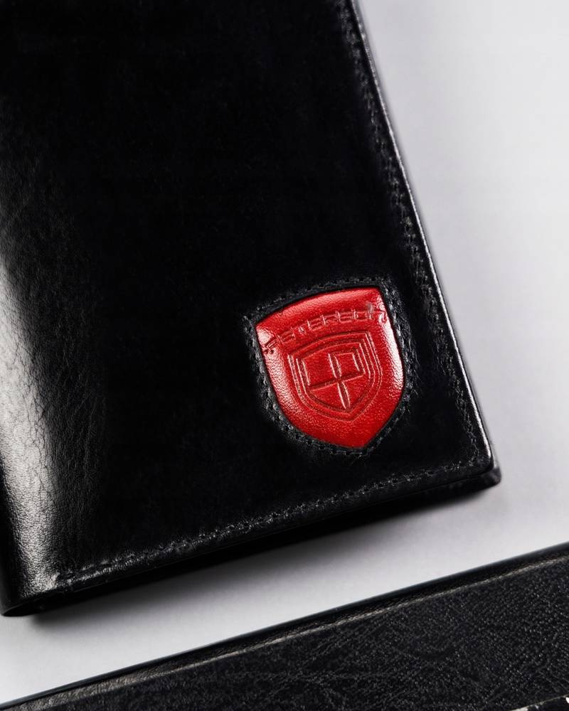 - Ergonomiczny design | Odszyty bardzo trwale z doskonałej jakości gładkiej skóry naturalnej w czarnym kolorze, dodatkowo na froncie portfela wyszyto trójkolorowy paseczek;