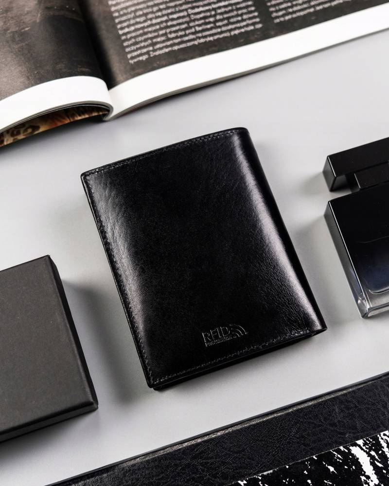 - Duży portfel o klasycznej stylistyce. Model w orientacji pionowej bez zapięcia zewnętrznego;